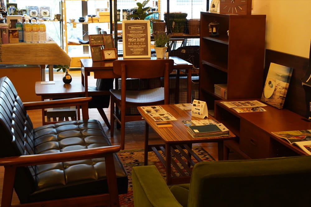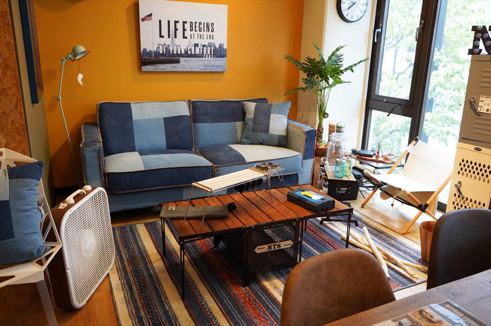 同社のオリジナルブランドであるビメイクスのCALIFORNIA50’s SOFAを中心に展示されたインテリア空間。