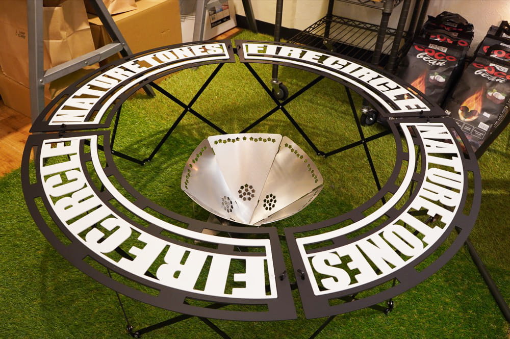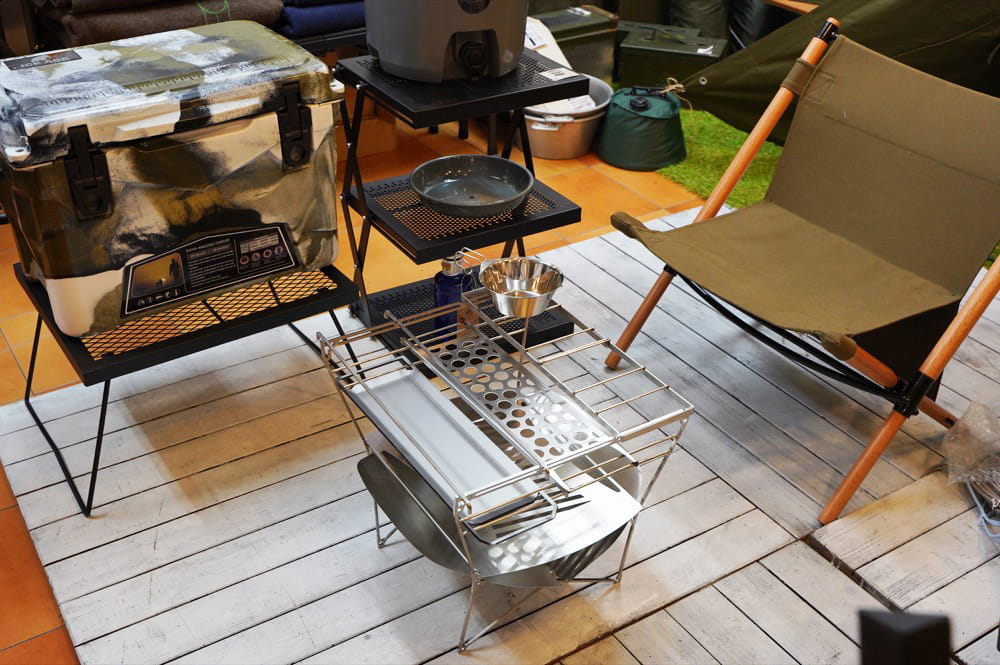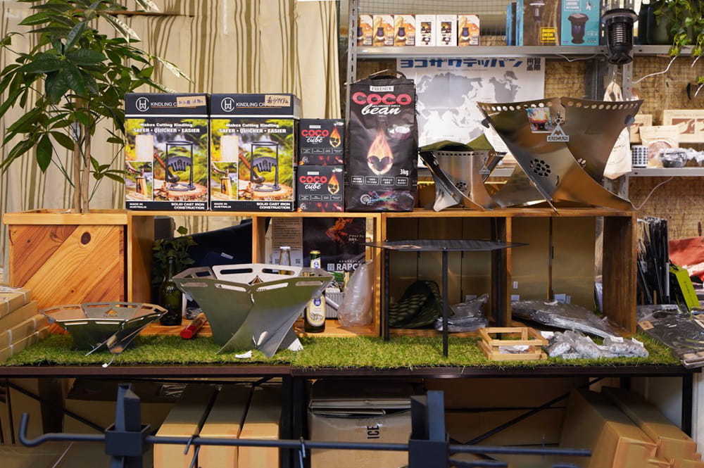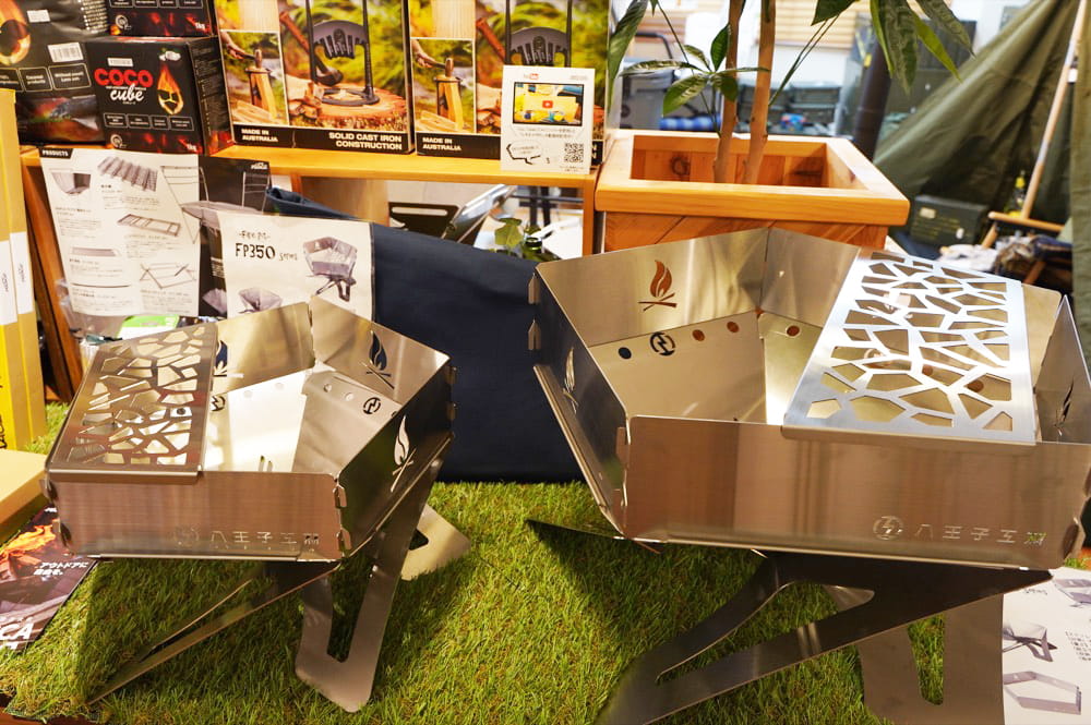 写真は、八王子工材の焚き火台、ステンレスファイヤーピット。他にもヨコザワテッパン(冒険用品)、OZOPS M8ストーブ、KEMURINO キャンパーズスパイス、もぐもぐファーム 太陽のオリーブオイル、さらに同社オリジナルのLAMP COFFEEとのコラボコーヒーなど地元八王子の製品を積極的に発信しています。