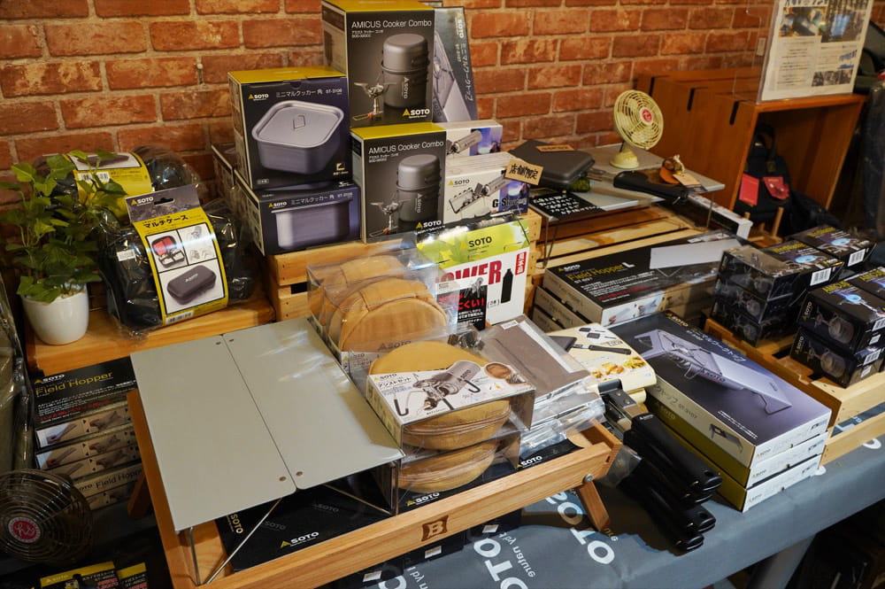 ほんの一例ですが、店内のアウトドアギアをご紹介。こちらはSOTO製品のコーナー。