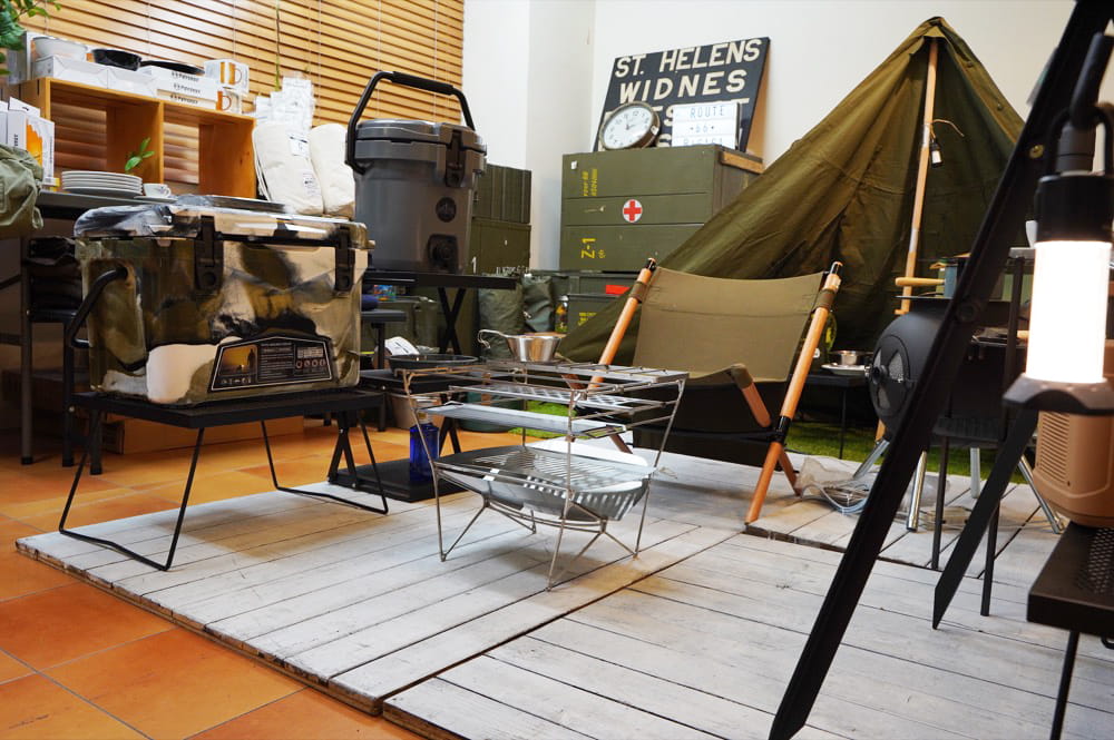 そんな中に、ガレージブランドの38explore製ウッドテーブルや、アウトドアファニチャーメーカーのNATURE TONES製テーブルなどが違和感なく馴染んでいます。