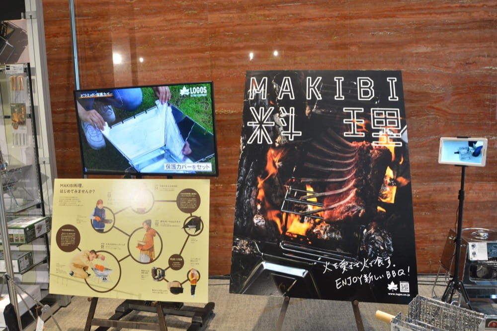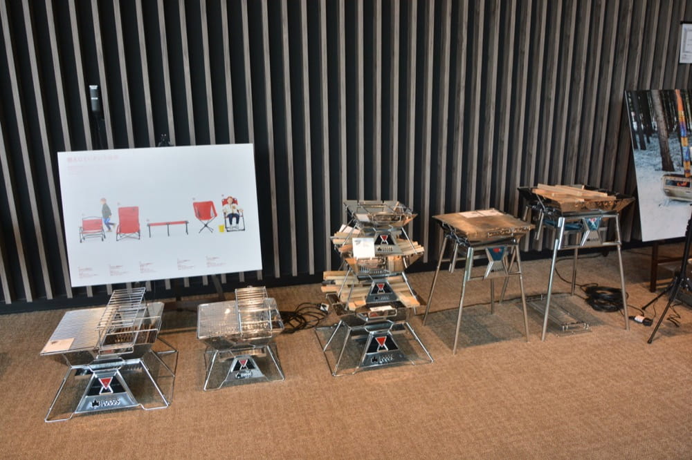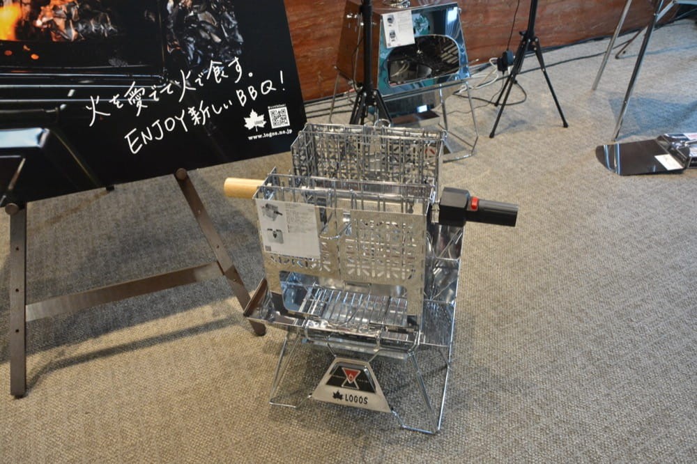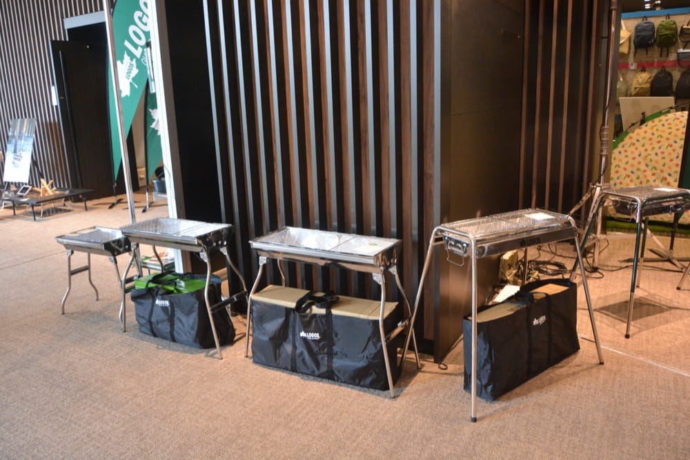 焚き火台関連も充実の展示。LOGOSさんの焚き火台で代表的な製品である「ピラミッドTAKIBIシリーズ」ですね。