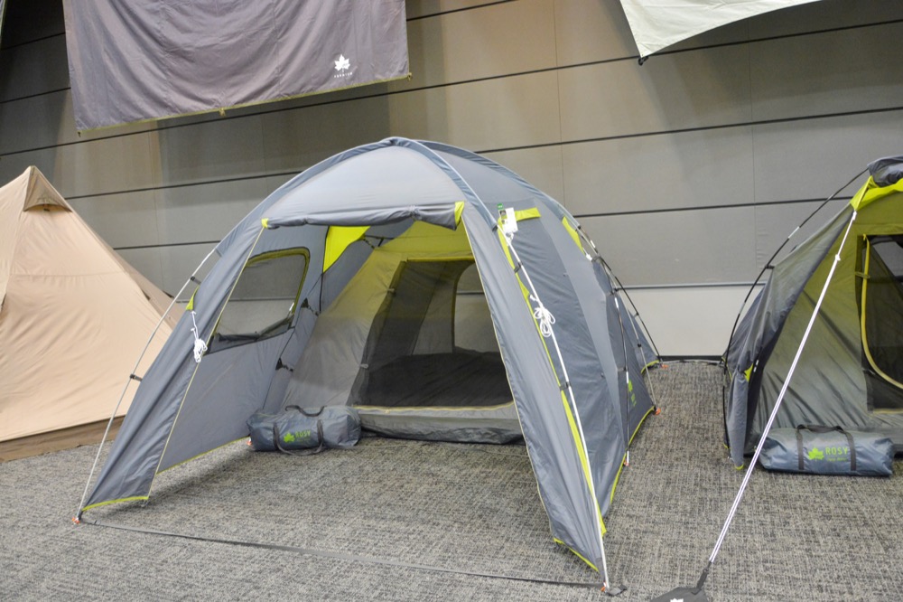 こちらはリーズナブルな価格帯のLOGOS ROSYのテント。グレーと黄緑の組み合わせが特徴的。LOGOSシリーズとはまた違う印象ですが、作りはしっかりLOGOSクオリティなので安心です。