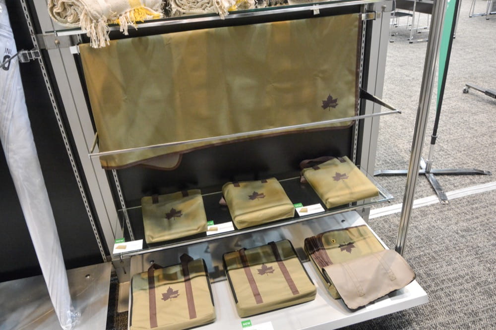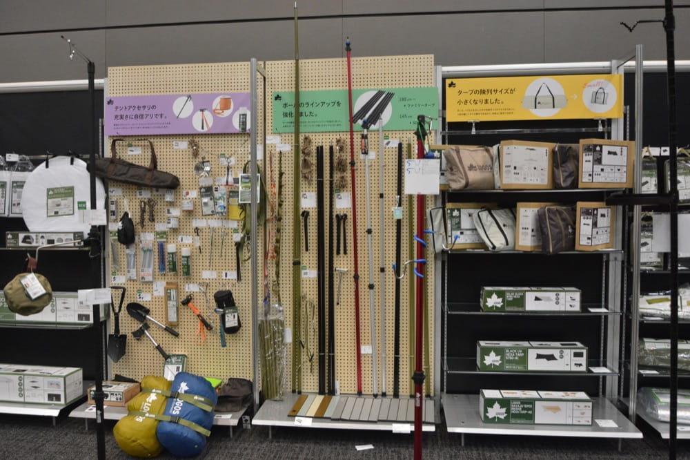 今回の展示会の目玉として、タープ製品の販売方法の変更があります。具体的には、タープ本体とポールのセット販売をやめ、別売りになったとのこと。