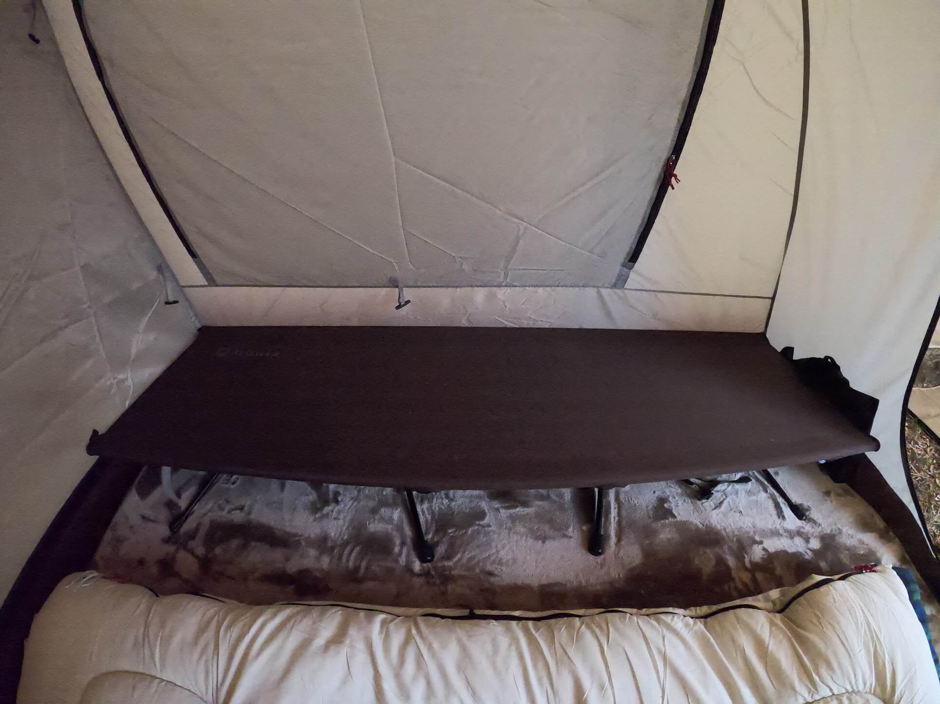 子供は母親と一緒に寝るため、コット(写真参照。外で使う簡易ベッド)で寝ることは出来ません。コットは一人向けのサイズ感ですし、寝相が激しく落ちてしまいます。