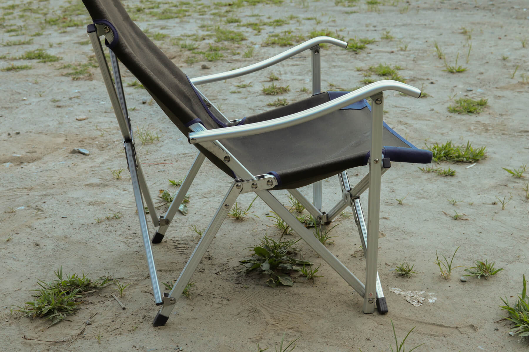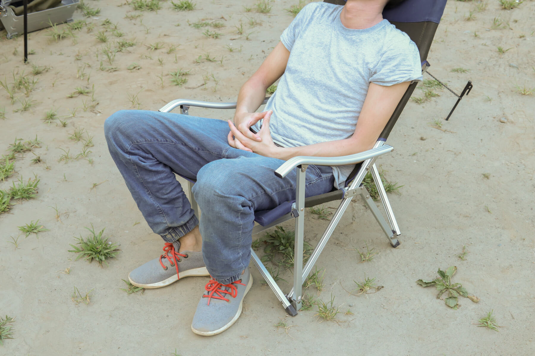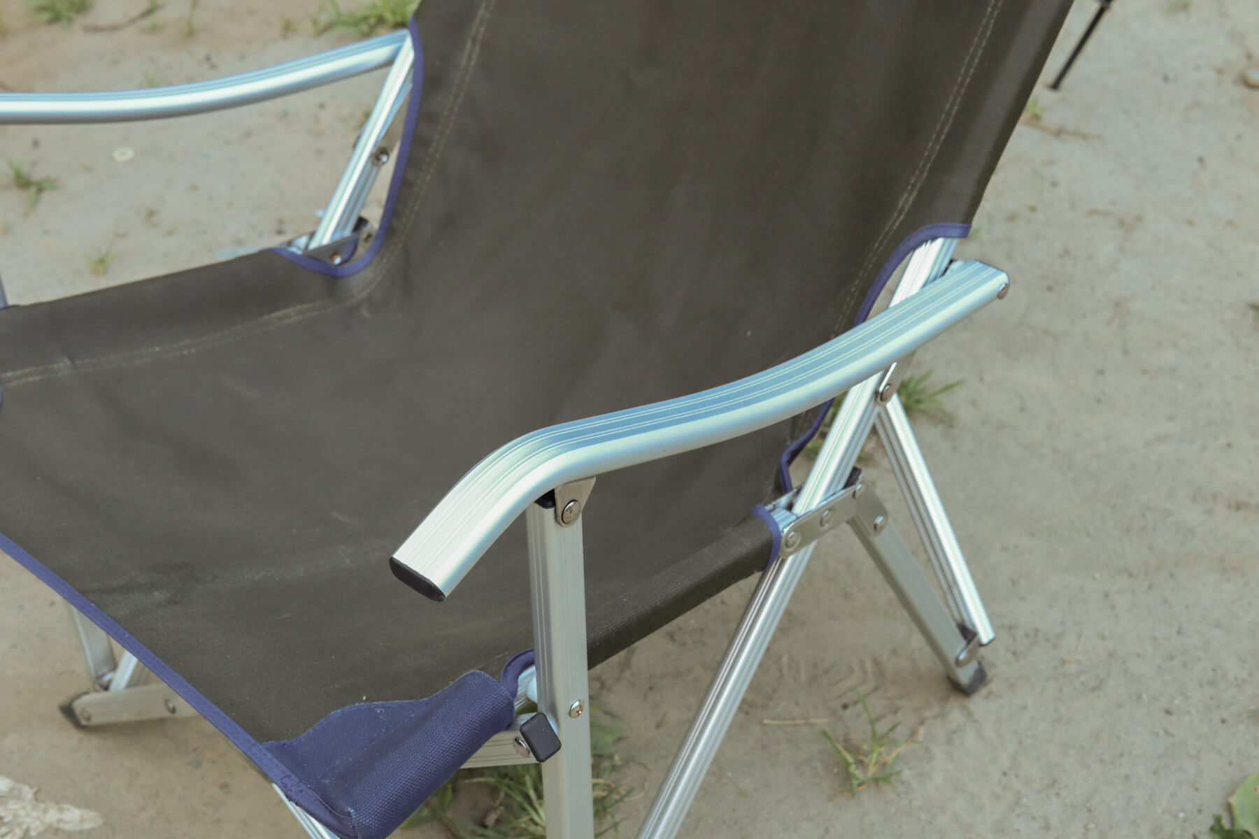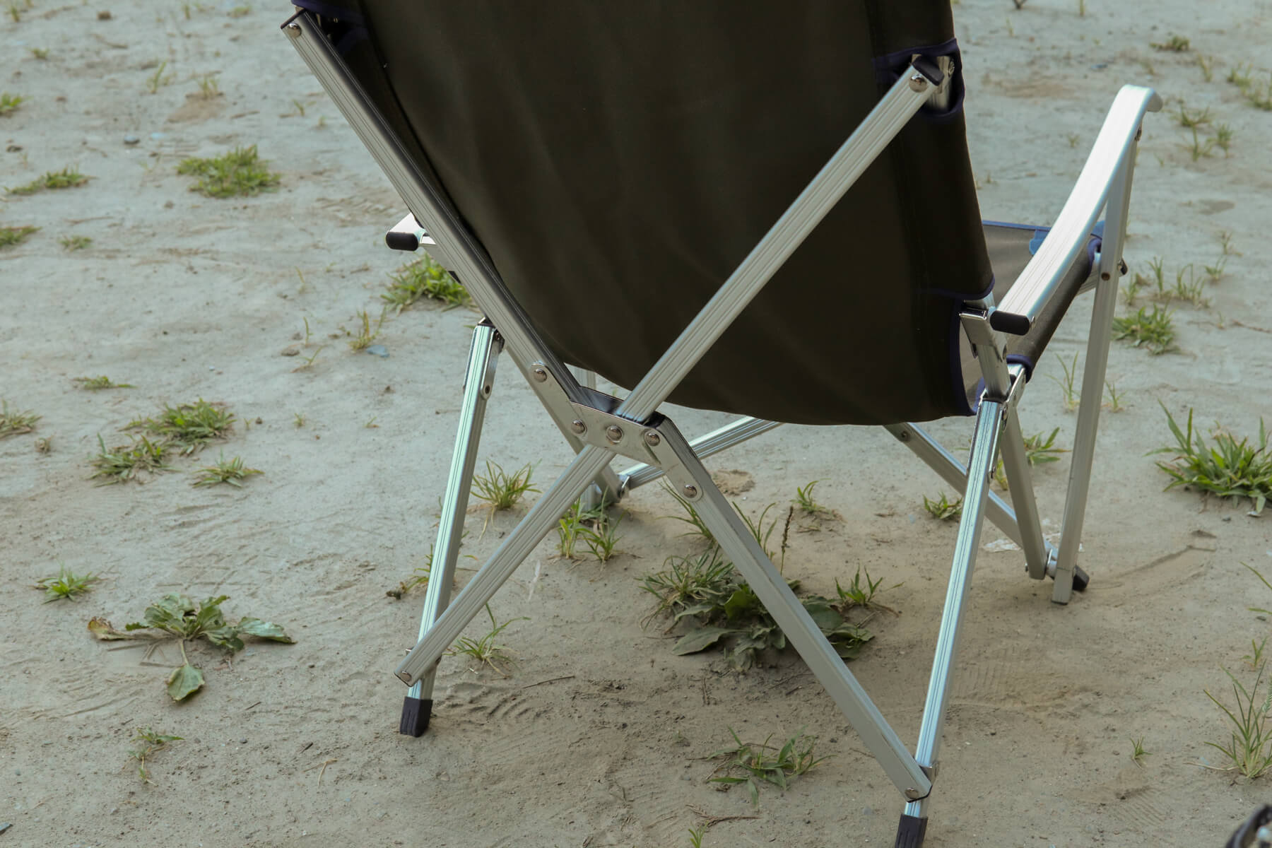 一見華奢なようにも見えるジュラルミン素材の脚がしっかりと荷重をホールド。このしっかりとした安定感は、昨今流行している軽量・コンパクト重視な折りたたみチェアにはないものです。