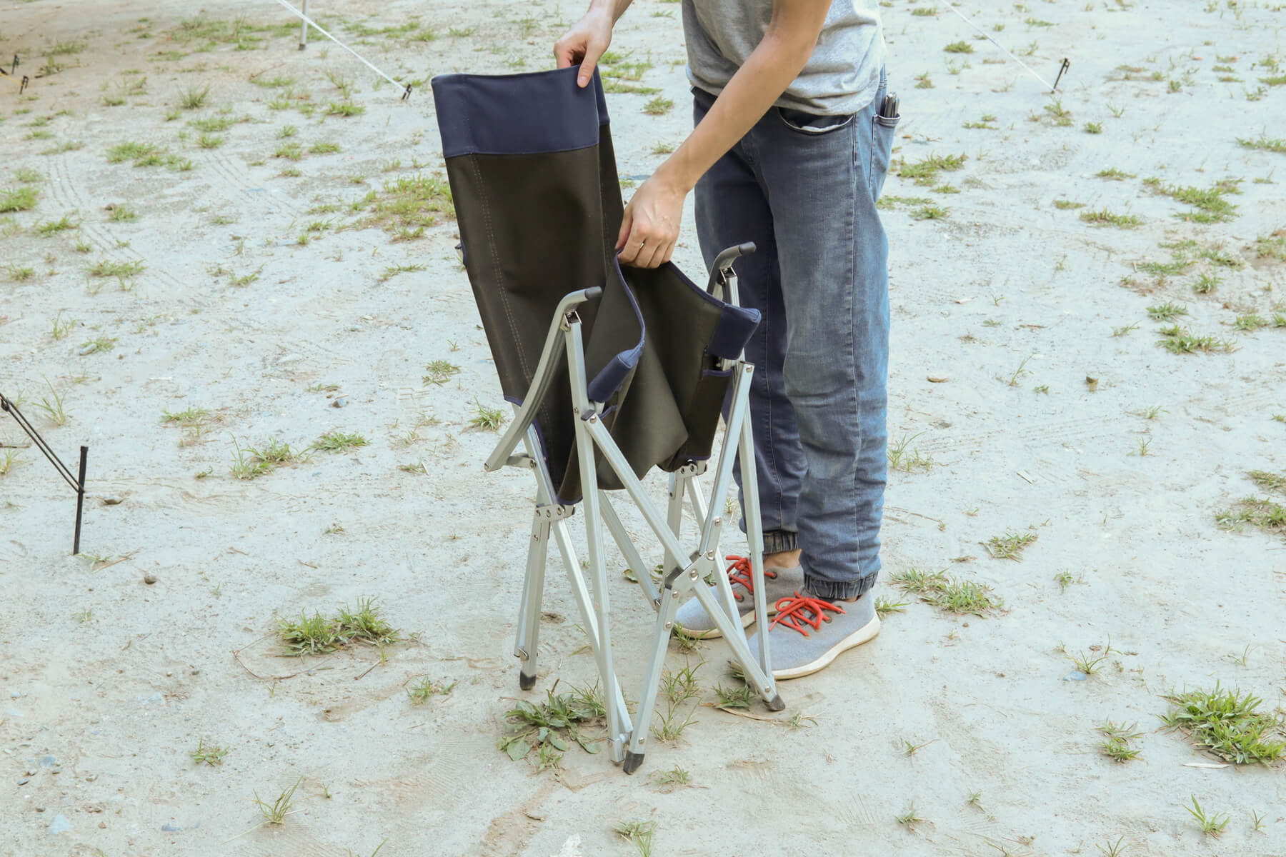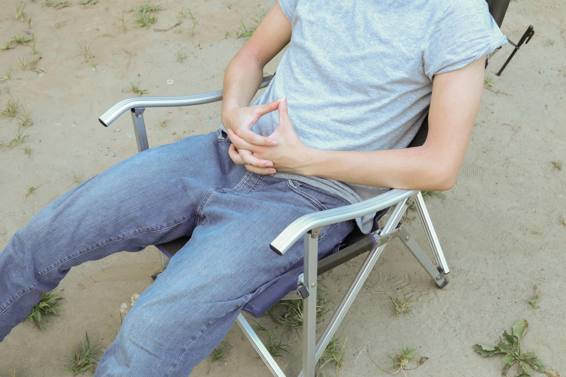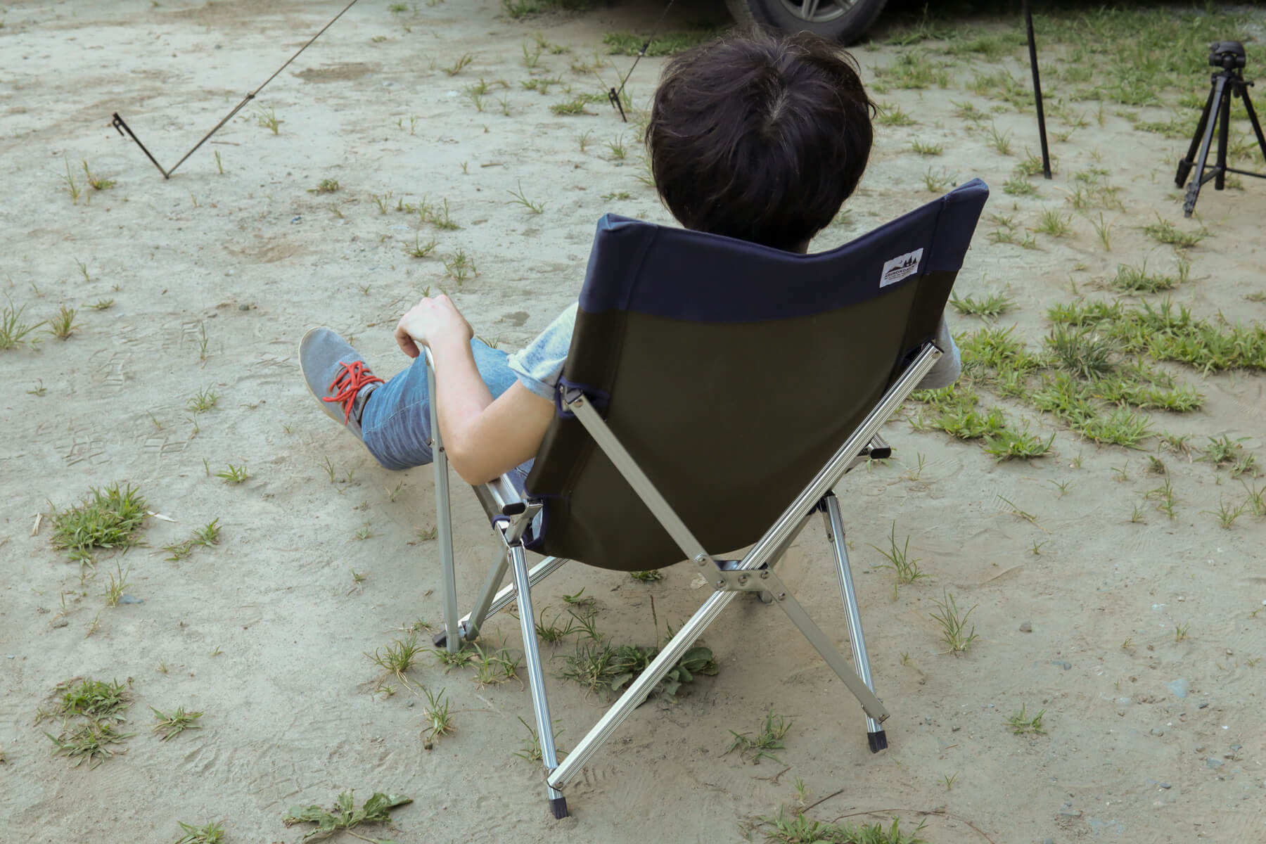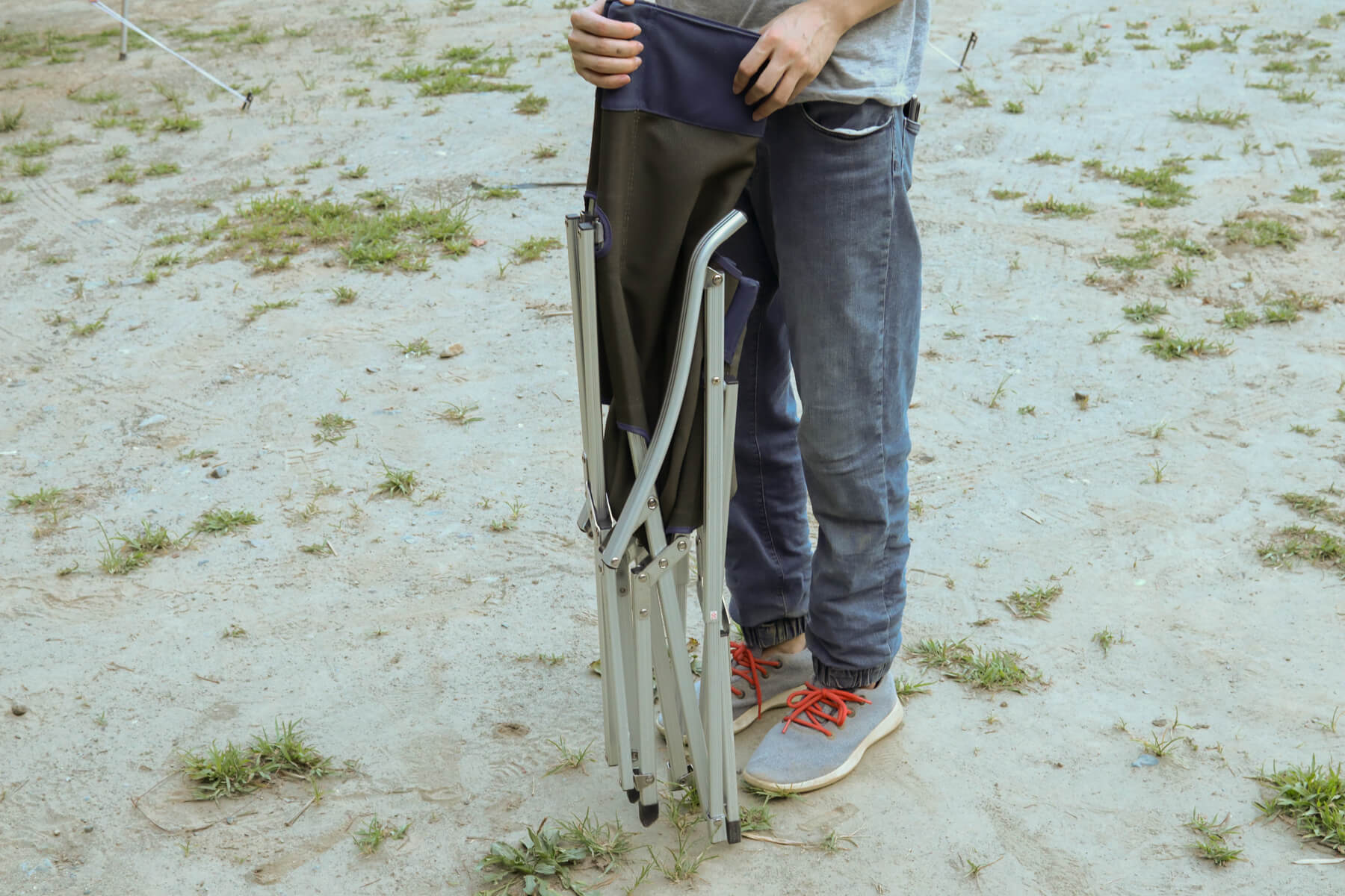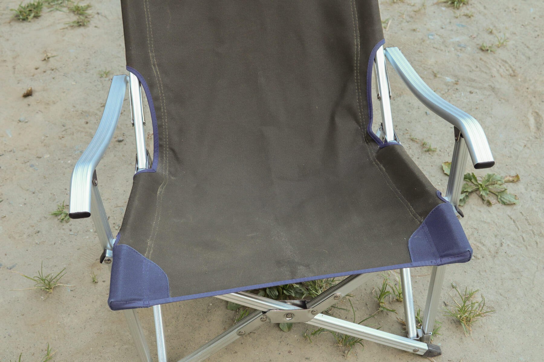 一見華奢なようにも見えるジュラルミン素材の脚がしっかりと荷重をホールド。このしっかりとした安定感は、昨今流行している軽量・コンパクト重視な折りたたみチェアにはないものです。