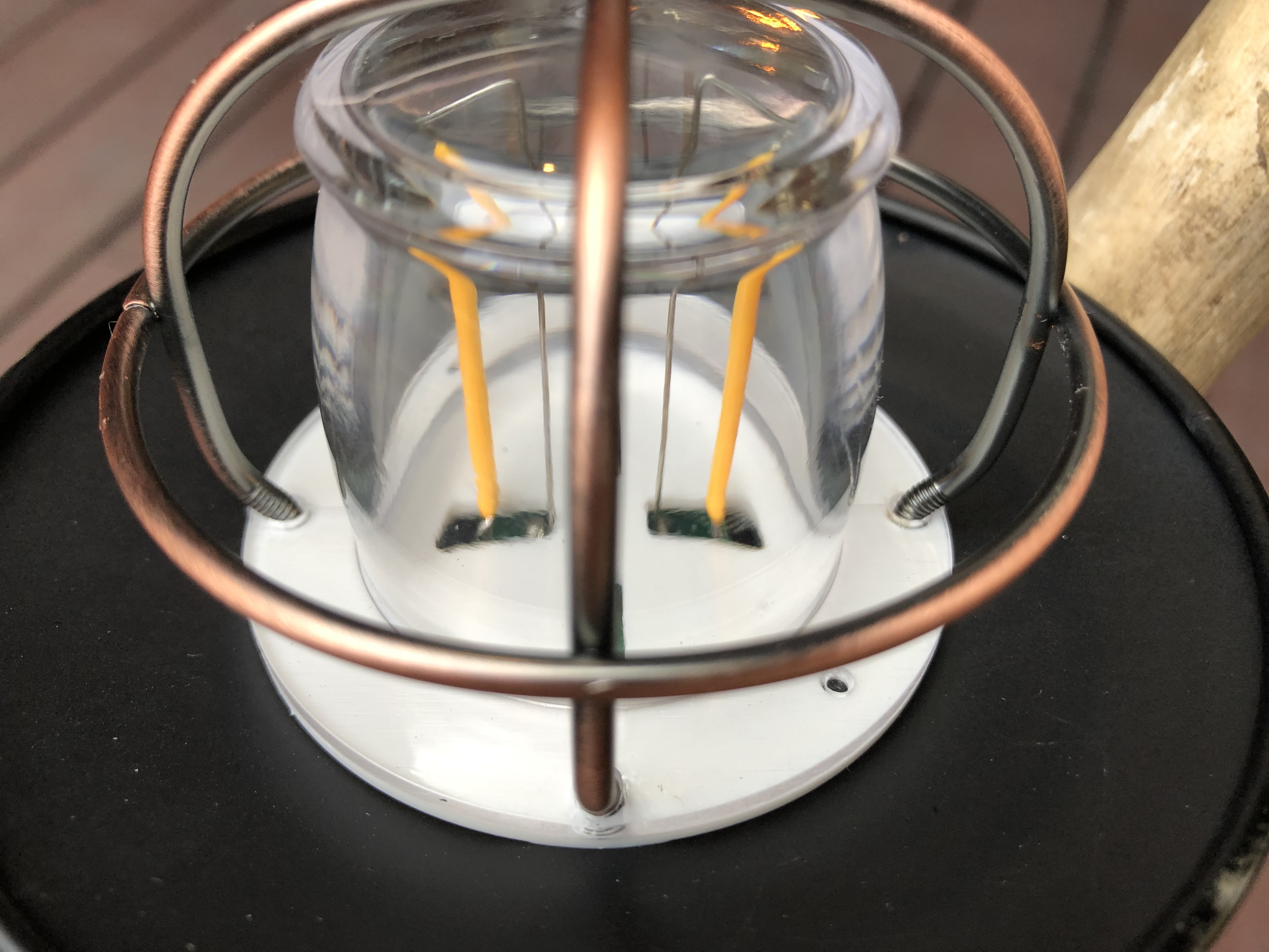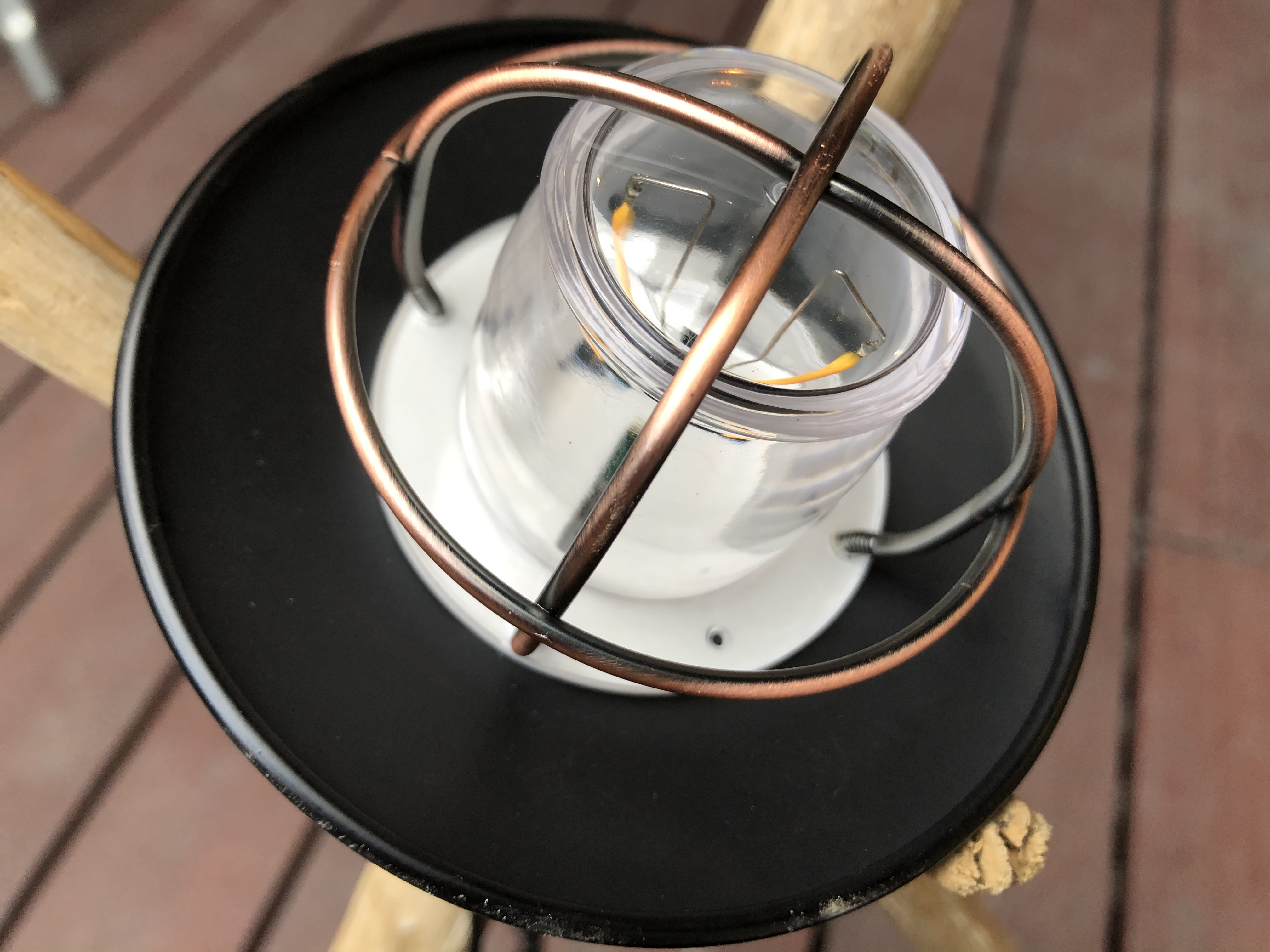 ランタン調のディティールを際立たせる、金属製のヒートガード付き。とは言っても、LEDライトですので熱は発生せず、あくまでもデザイン上のアクセントです。