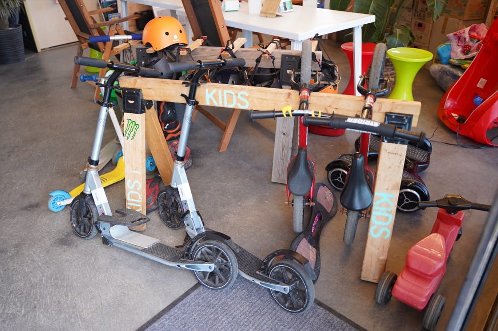 遊具などの貸し出し品も超充実。キックボード、バランススクーター、幼児用自転車、3輪車など勢揃い。