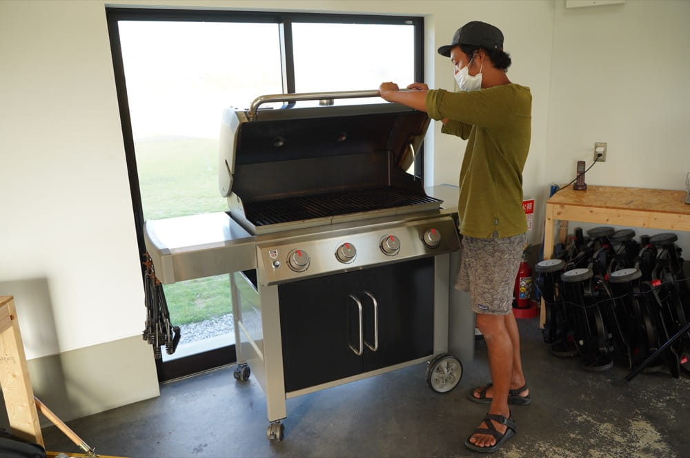 炊事棟に超巨大なウェーバーグリルもあります。なかなか個人レベルでは使うことのない迫力のビッグサイズ。こちらはプロパンガスを燃料源とする本格派。