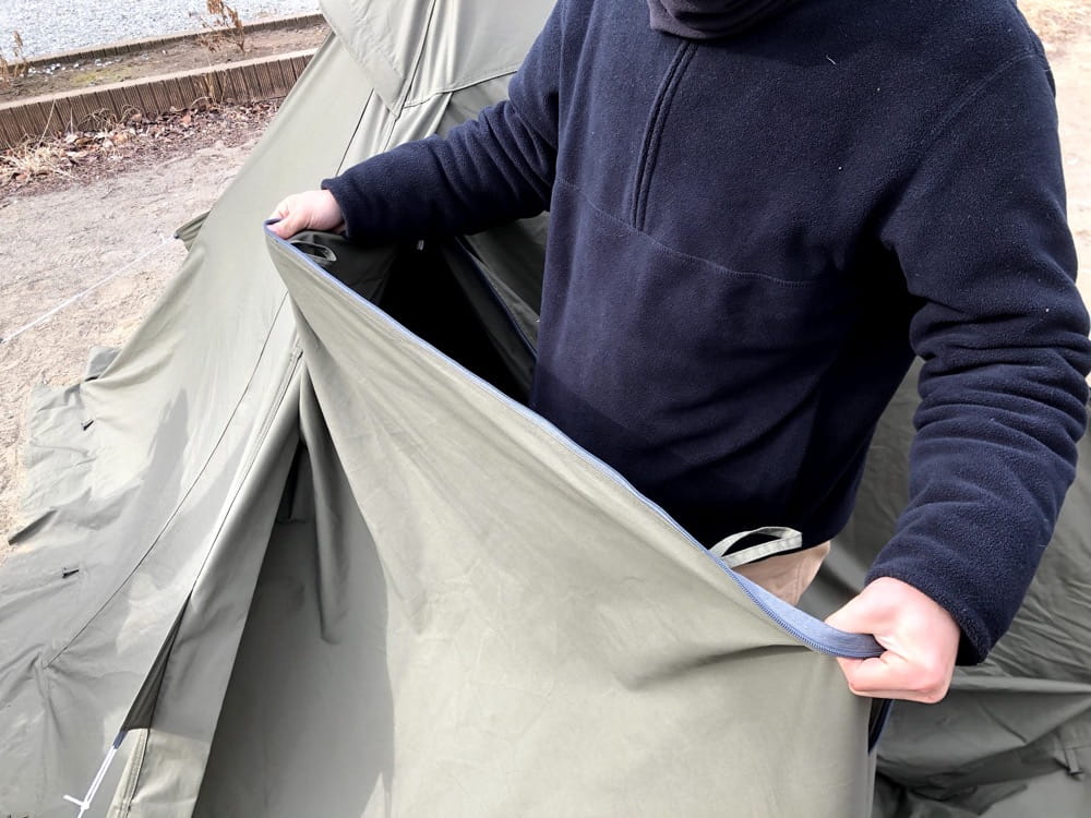 フロントドア(フラップ)は必ずしもポールで立てる必要はなく、写真のように巻きつけてもOK。