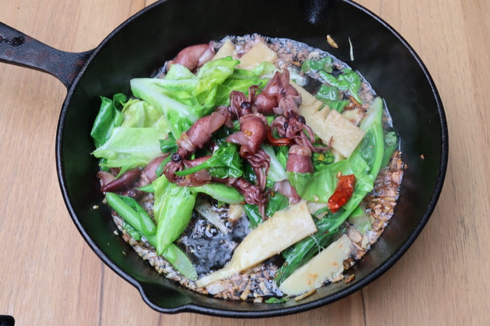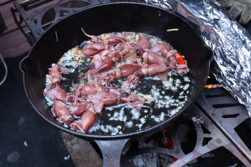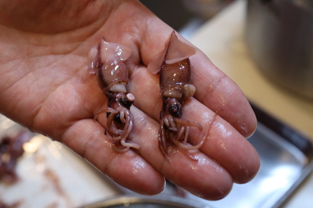 ホタルイカは油が跳ねることがあるので火は強すぎない方がよい。ボイルなので、焼き加減はそれほど気にしなくて良い。