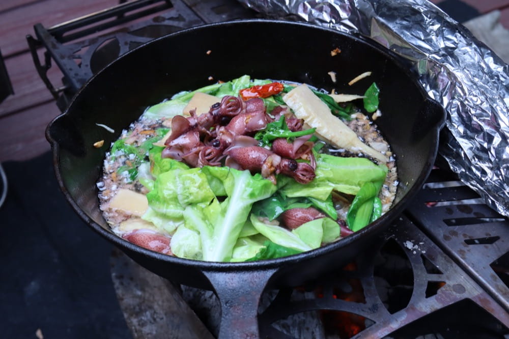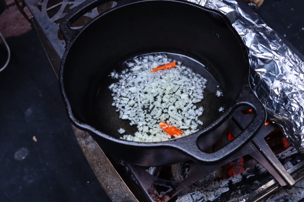 ①スキレットに100ccほどのピュアオリーブオイルと塩少々を入れる