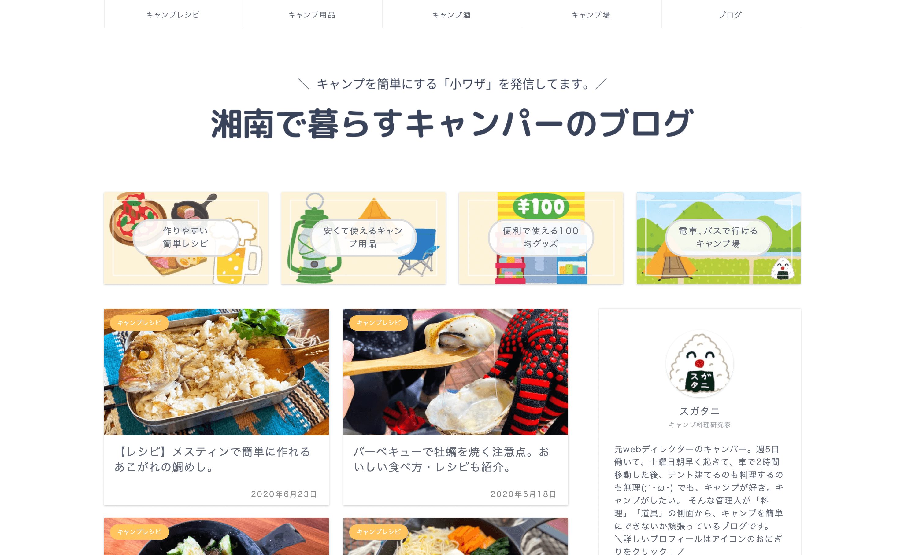 湘南で暮らすキャンパーのブログさん。元Webディレクターのスガタニさんが運営されているという事で、センスが良くスッキリとしたデザイン性の高いサイト構成が素敵です。