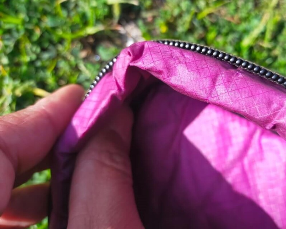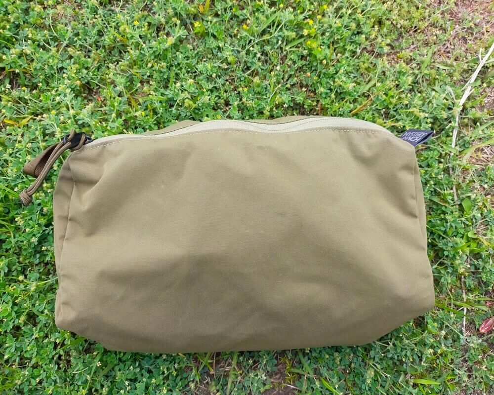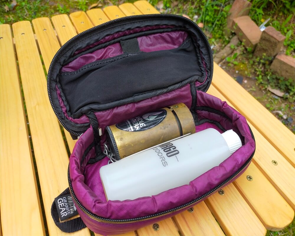 肉厚なので、ランタンやデジカメなどのガジェットを入れて使用しています。ジッパー部分は止水ファスナーを採用しているので、多少の雨なら中身が濡れることがありません。
