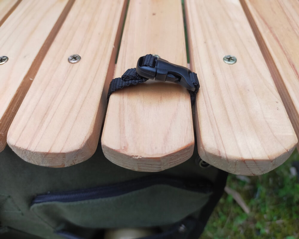 両サイドにはアジャスターバッグルがあるので、机やイスの端に吊り下げることができます。
