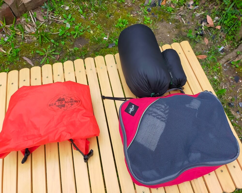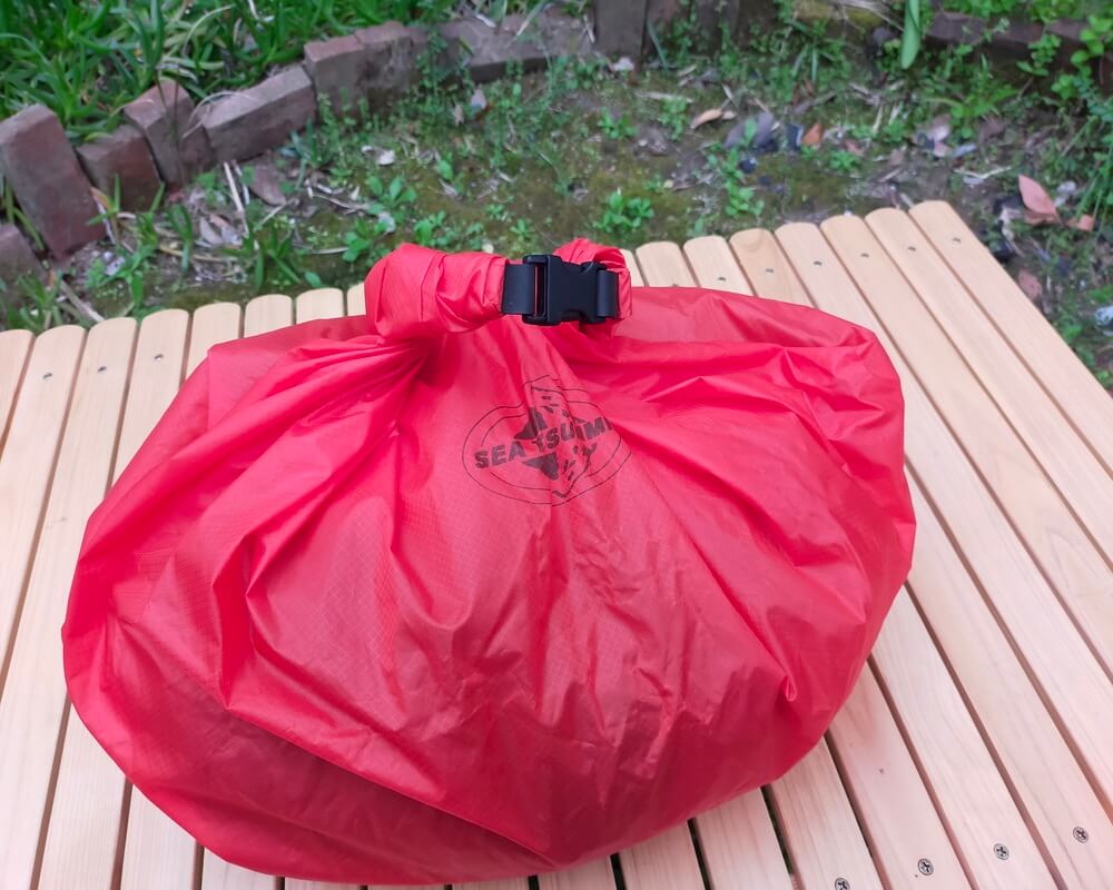 小物収納ではありませんが、衣類や寝袋などの絶対に濡らしたくないものを収納するには、完全防水で密封できるタイプのバッグをおすすめします。