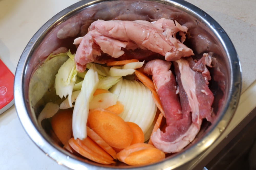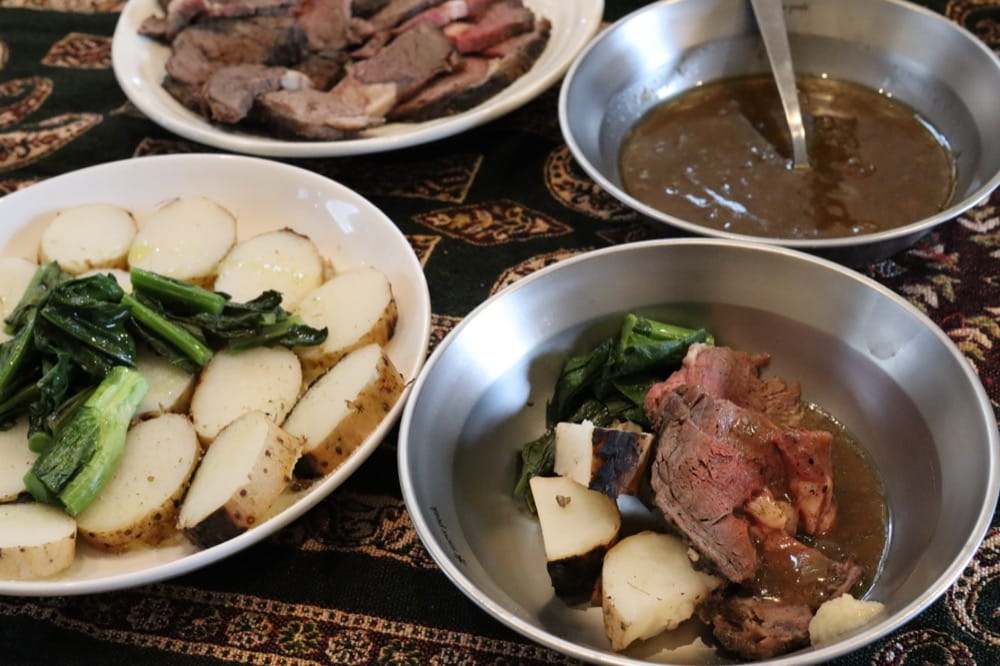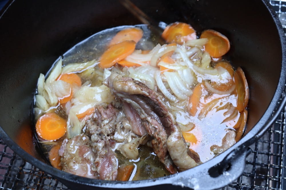 ①グレービーソースの材料の上に表面を焼いたキューブロールを置き、ダッチオーブンに入れて15分から30分ほど焼く