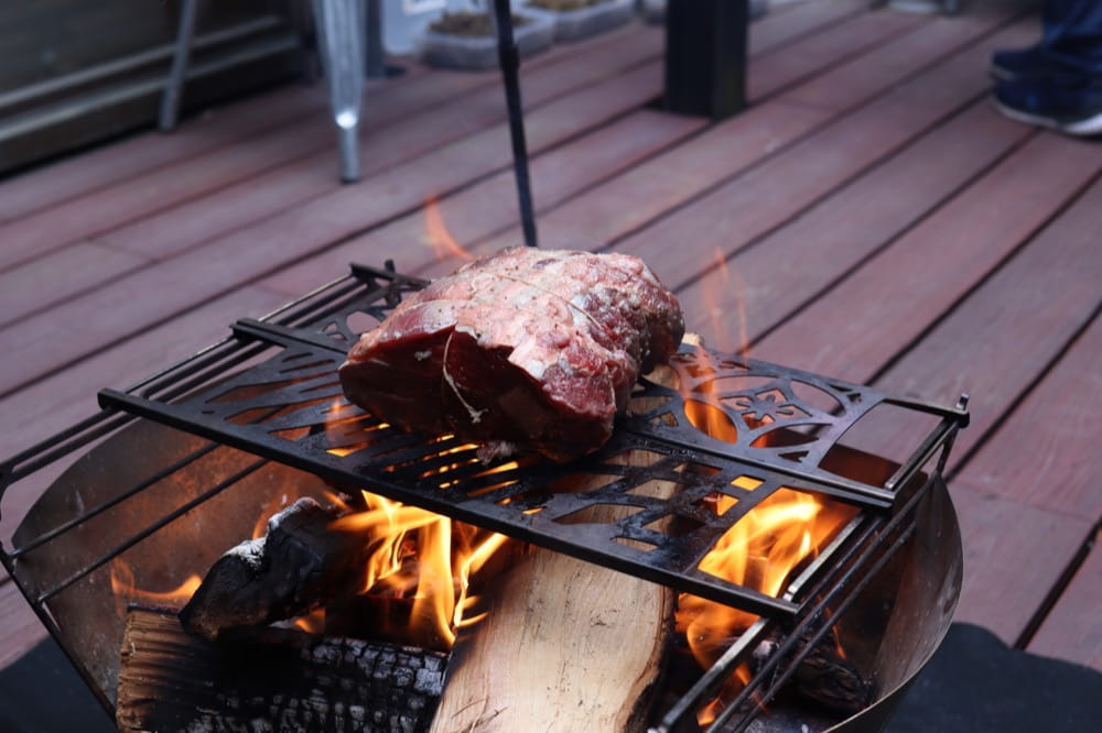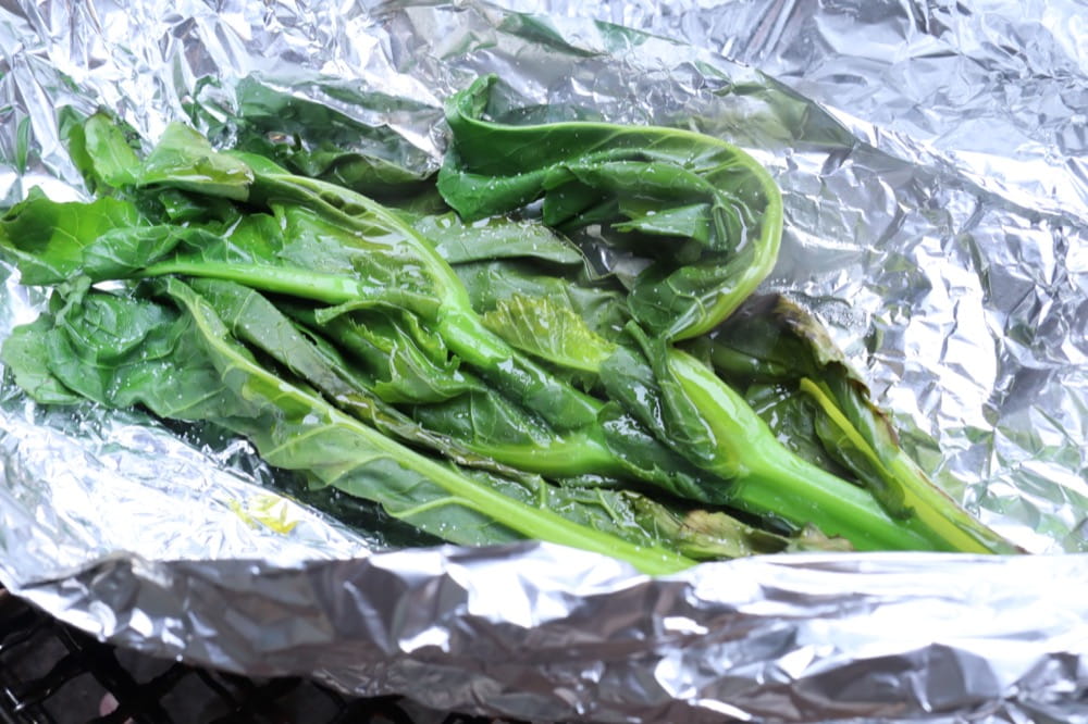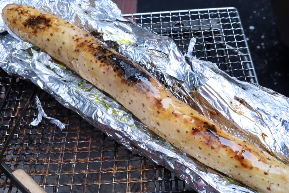どちらもアルミホイルで包んで焚き火台の上で焼くだけ。最後にオリーブオイルと塩で仕上げます。