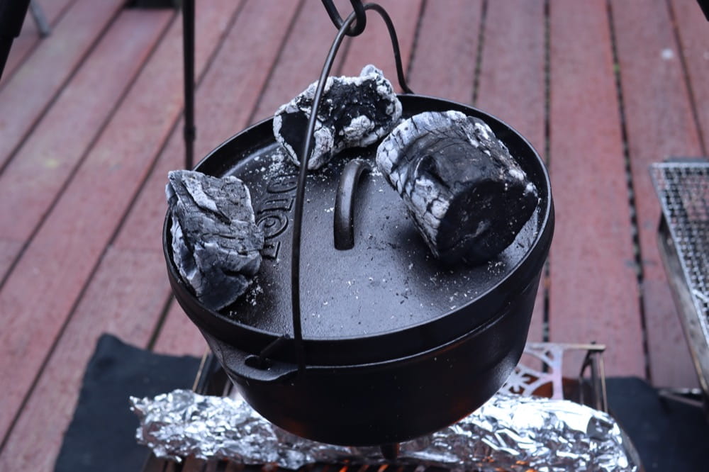 ②ダッチオーブンのフタの上に炭を置いて上下から熱する