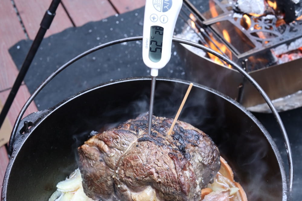 ③温度計で中心部部の温度を測り、〜80℃程度になるまで熱する。(60度ぐらいでレア。お好みで。)