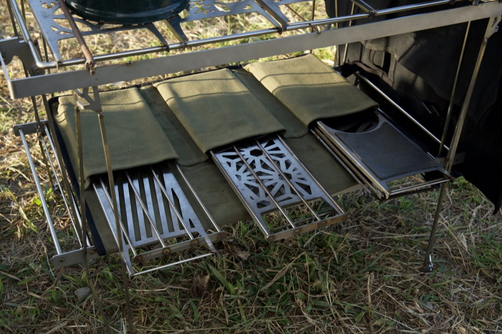 焚き火を囲むキャンプスタイルにおいて、簡易的なツールラックとして使用することができます。不安定な場合は、重さのあるもの(石など)を中心に入れるとぐらつきが解消されます。