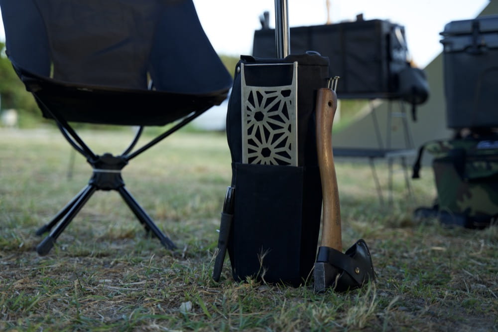 ポケットは3箇所で、サイズが合えば他社製のごとくや、焚き火ツールを収納することも可能。バトニング用ナイフ、火吹き棒、焚き火用トングなど、さまざまなギアをすっきりしまうことが出来ます。