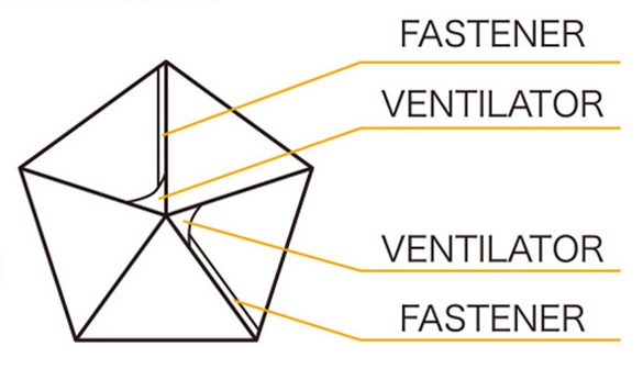 五角形の前後2箇所に入り口があるため前後非対称。そして前側にしかサイドフラップがついてません。