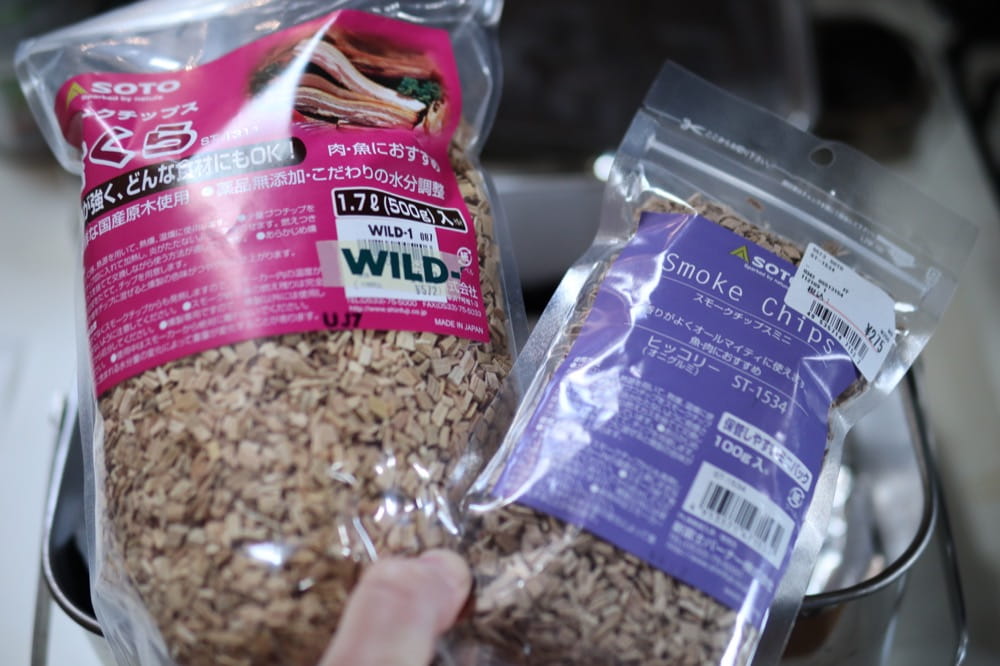 普段はもっともスタンダードなSOTO製の桜チップ(左)を使用しています。癖がない香りでどんな食材ともよくマッチします。