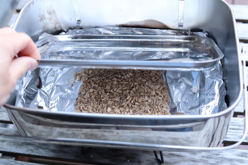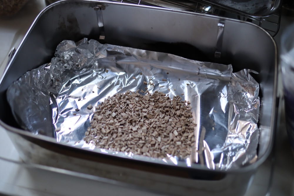 まず、本体底部にアルミホイルを敷いて燻製チップをセットします。食材の量に合わせて微調整しますが、だいたい写真ぐらいの量をおけば間違いないですね。