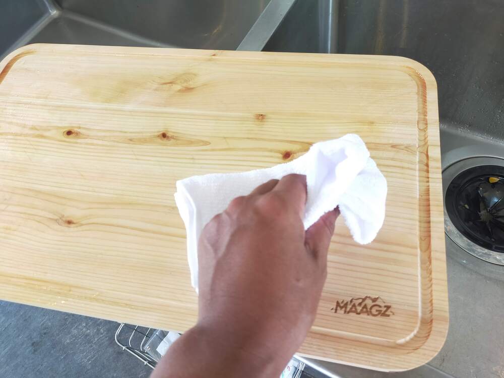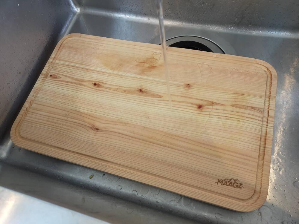 水で濡らすことにより、表面に膜ができるため、カットした食材からでた油や汚れ、においがカッティングボードにしみ込みにくくなります。