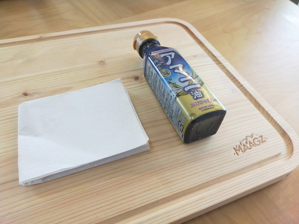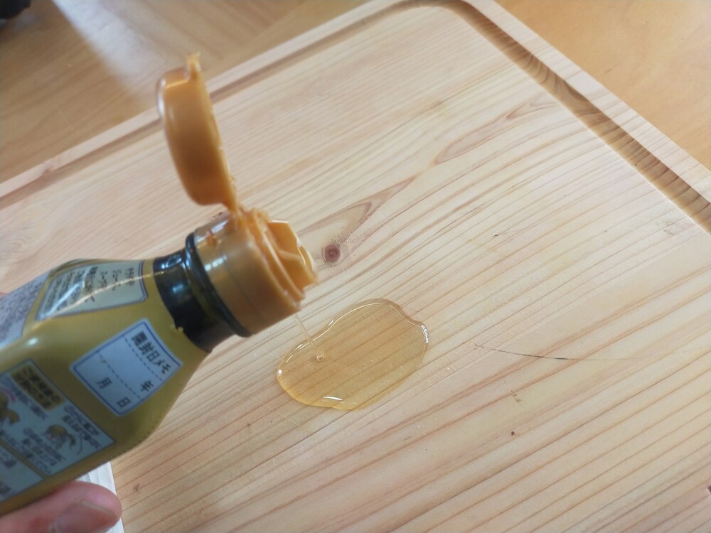 - カッティングボードに数滴オイルを垂らし、クッキングペーパーや布で木目に沿って薄くのばす。