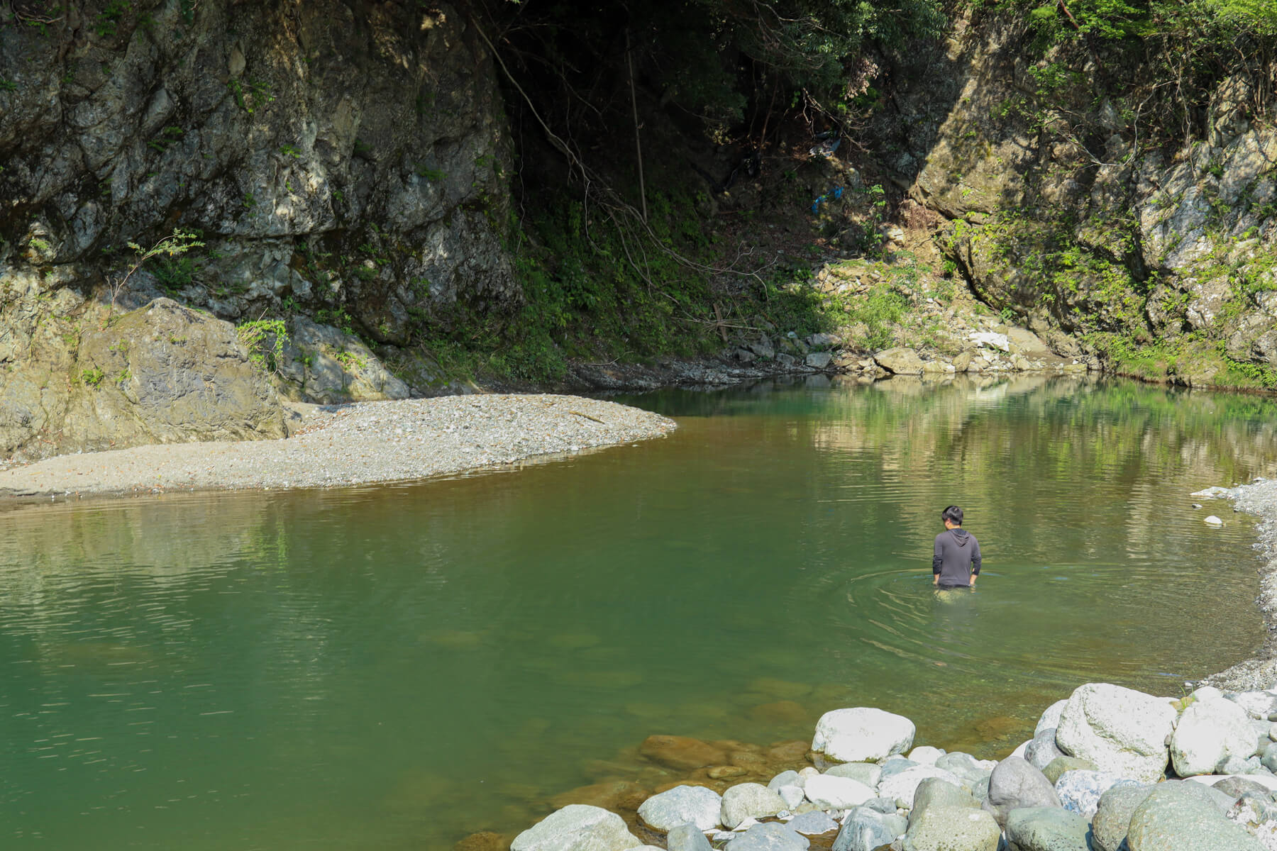 美しい道志川で遊泳を楽しむことが出来ます。この日は35度近い気温で暑い一日でしたが、ヒンヤリ冷たい道志川で適度に遊泳することで熱中症を予防しました。透明度が高く、水が綺麗なので非常に気持ちいいですね。