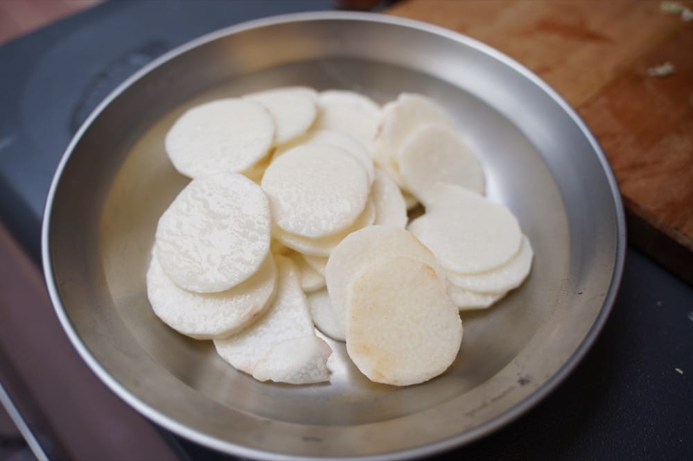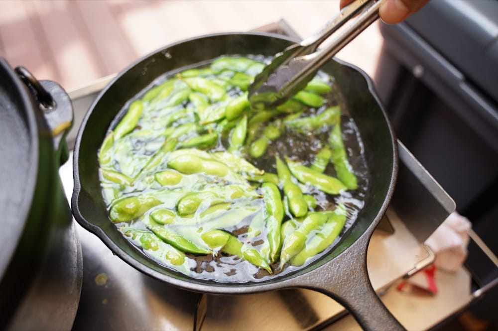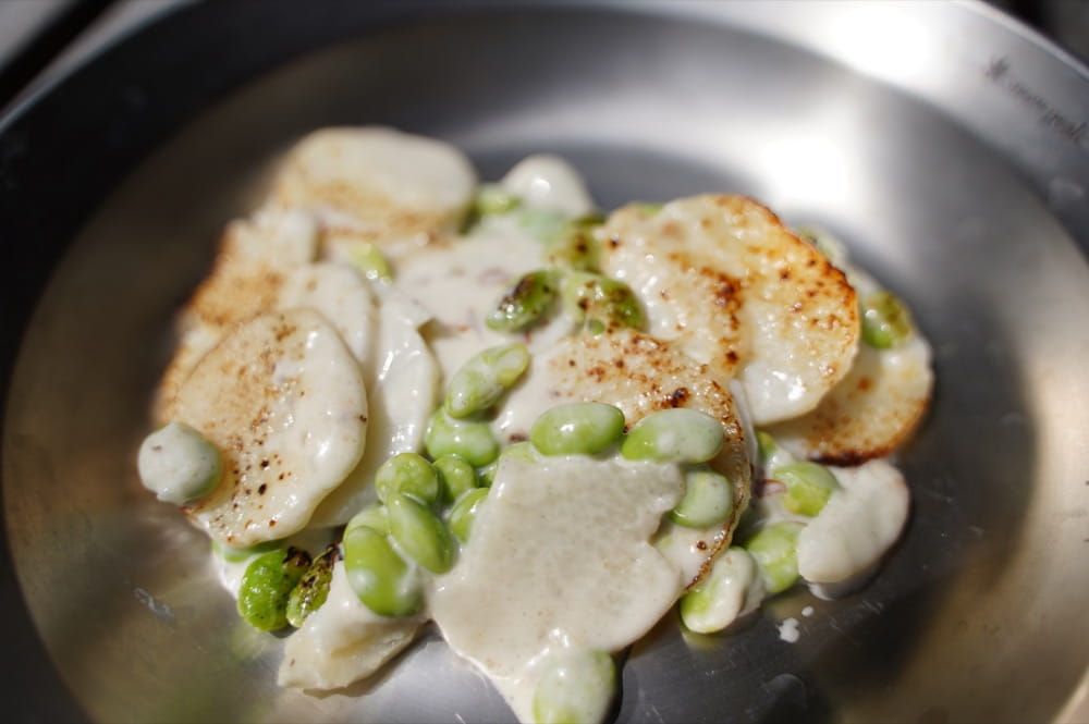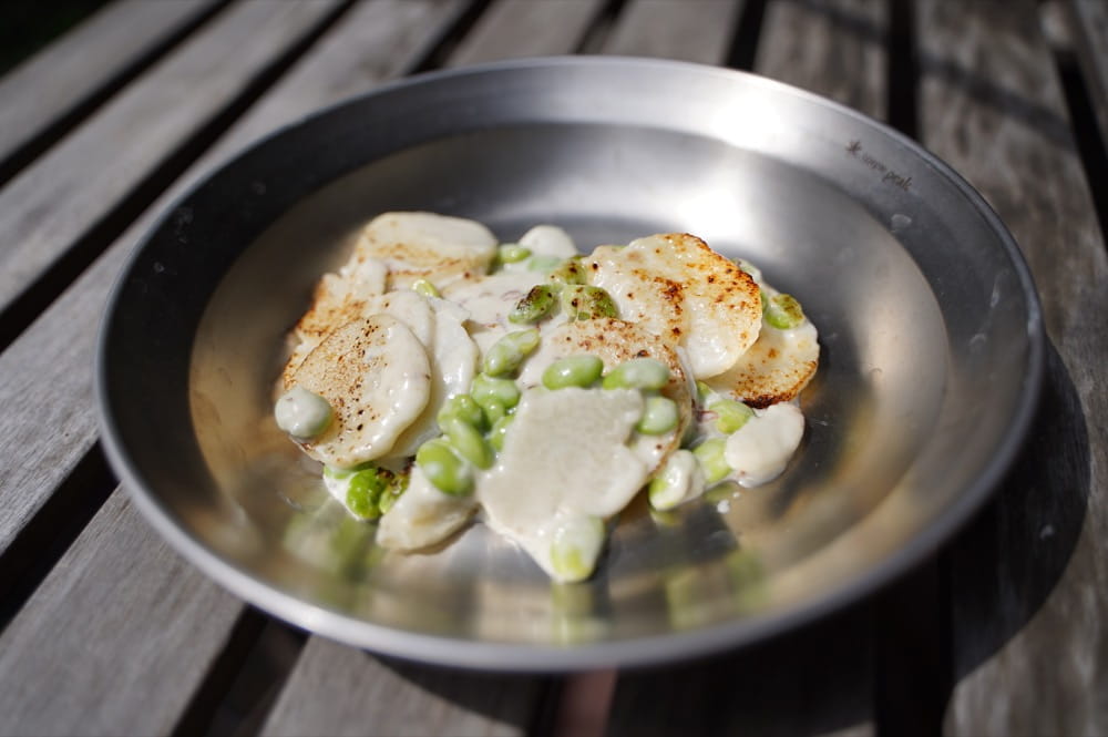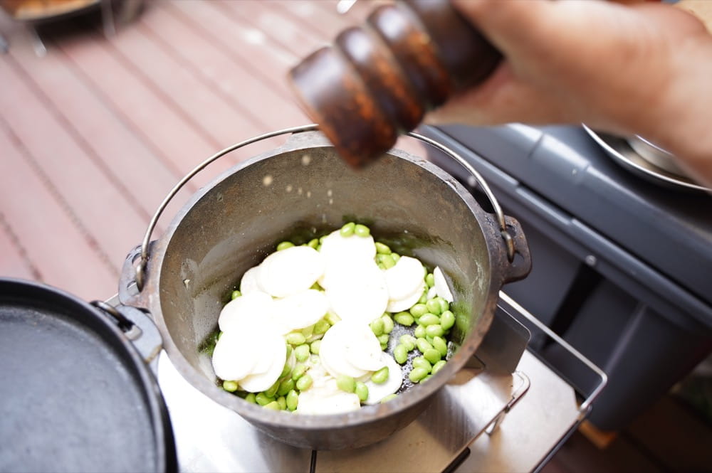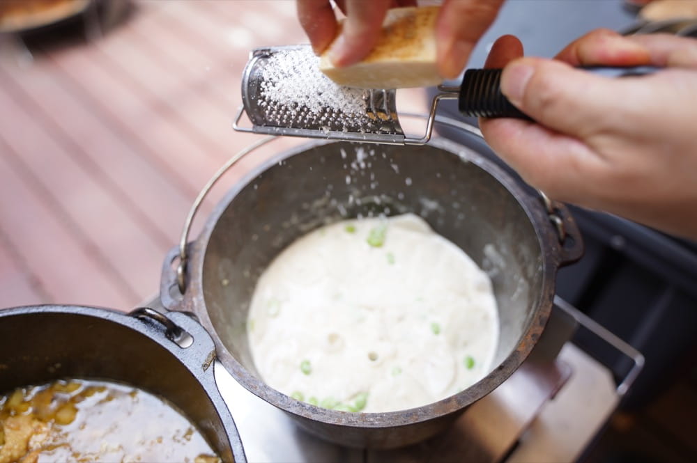 ⑨ダッチオーブンの蓋をし、上に炭を載せて焦げ目をつける(今回はバーナーで代用)