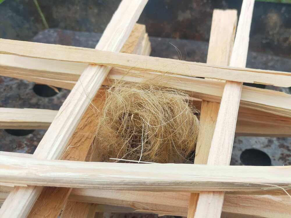 人差し指ほどの太さのよく乾燥させた針葉樹を井桁に組み、中央に麻紐をほぐした火口をいれます。