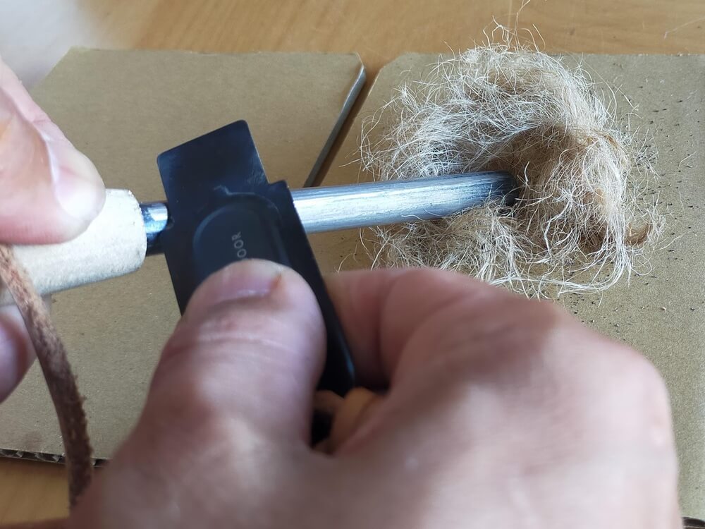 着火の前にストライカーをゆっくりスライドさせてロッドを削り、金属の粉を火口の間に貯めておきましょう。火口がより燃えやすくなります。