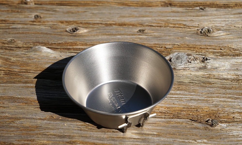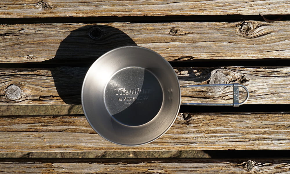 軽量なチタン製クッカーなどをリリースするアウトドアブランド「エバニュー」(EVERNEW)のチタン製シェラカップ。