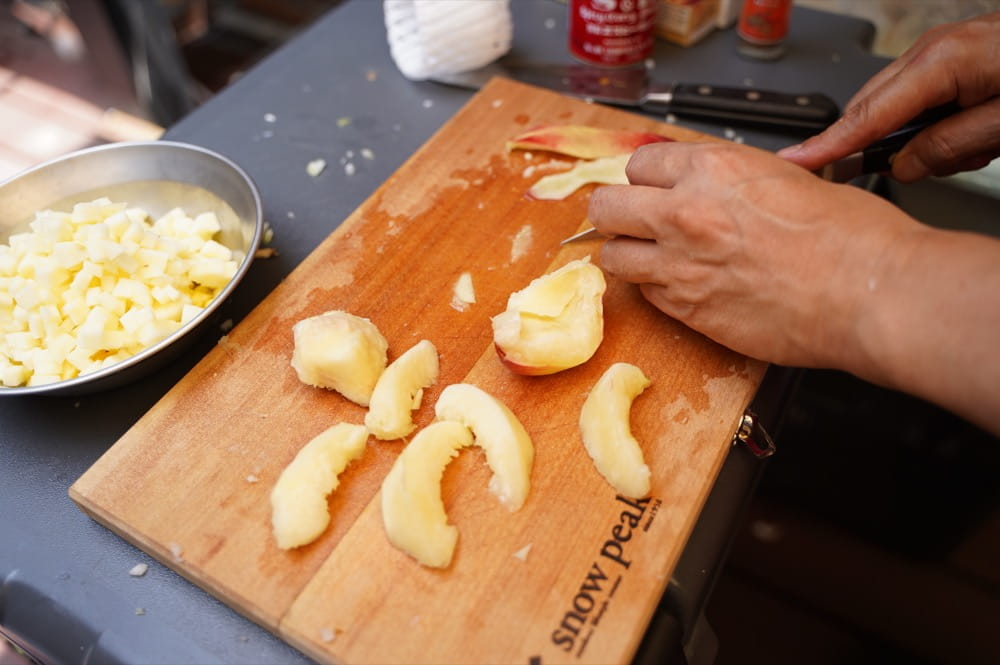 ⑥玉ねぎに火が通ったらフルーツを入れる