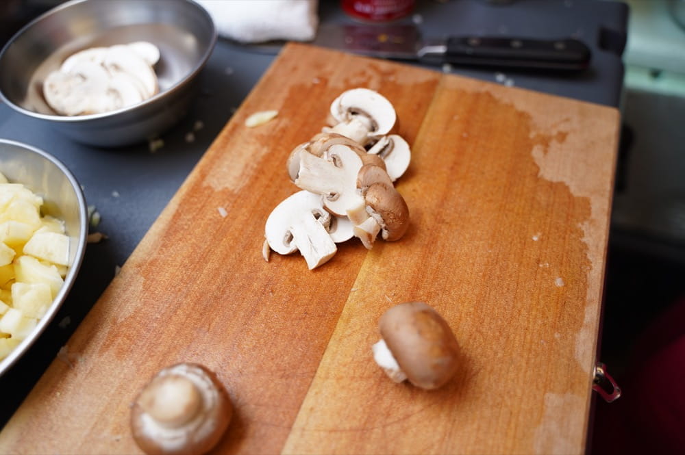 マッシュルームは端を厚めに切ると火を通したときに小さくなりすぎないです。