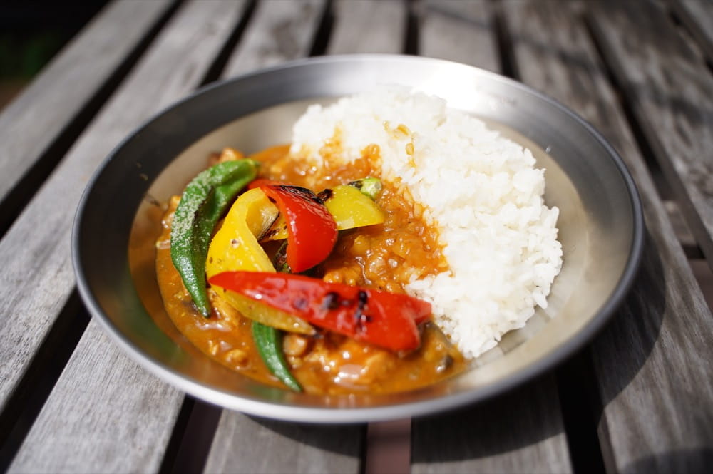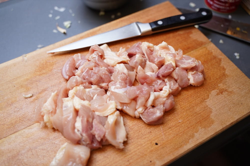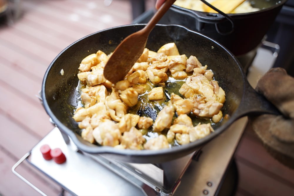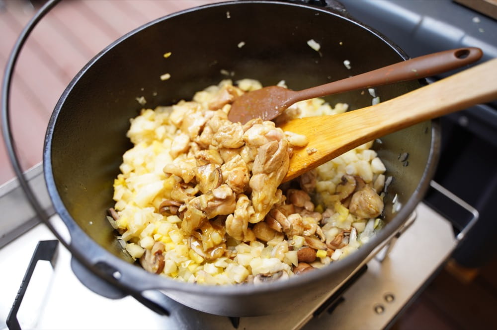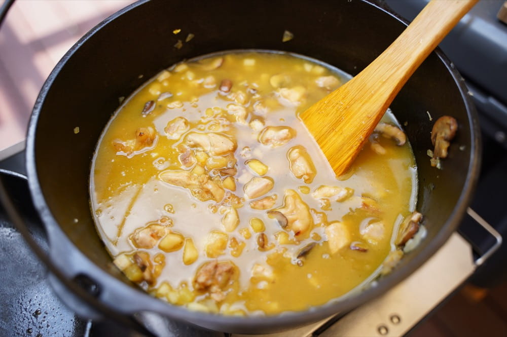 ⑧鶏肉をオリーブオイルでソテーする。表面をしっかり焼けたら白ワインで香りづけする。火を止めカレー粉をまぶし、よく絡める。
