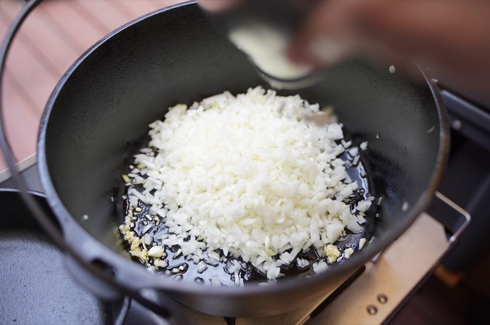 ⑤オリーブオイルにニンニクの香りがついたら玉ねぎを入れ、塩コショウを振る。
