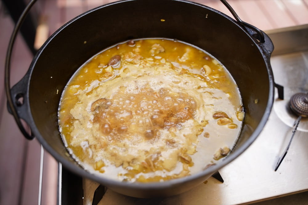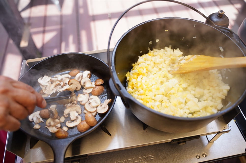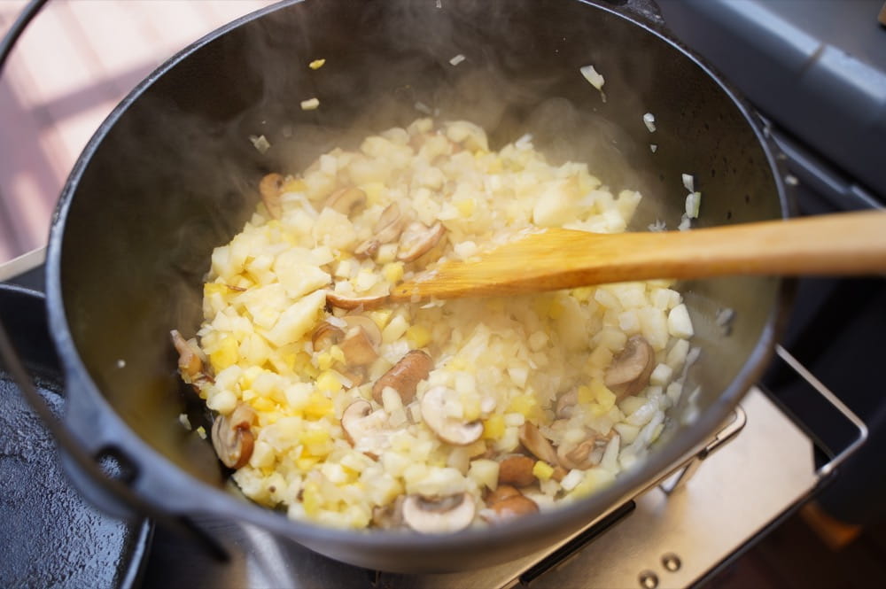 ⑦マッシュルームをオリーブオイルでソテーする。キノコの香りが出るようなイメージで。この一手間でグッと香りが良くなる。