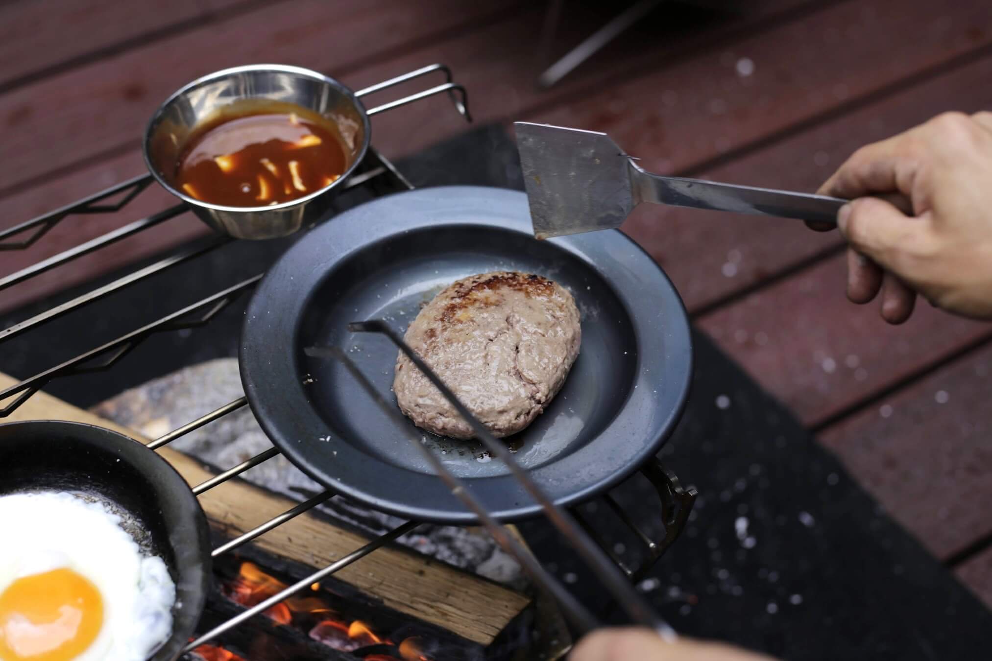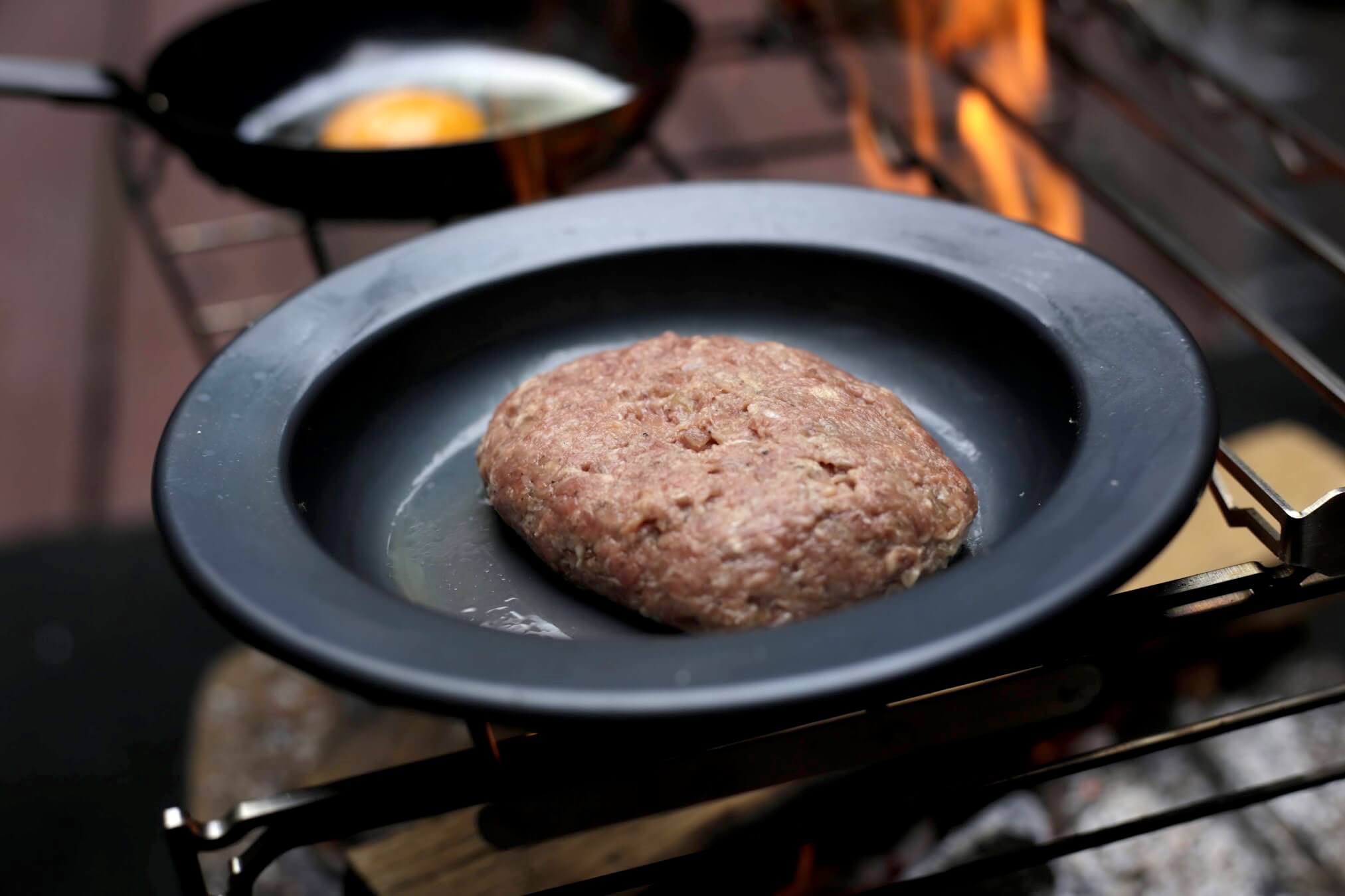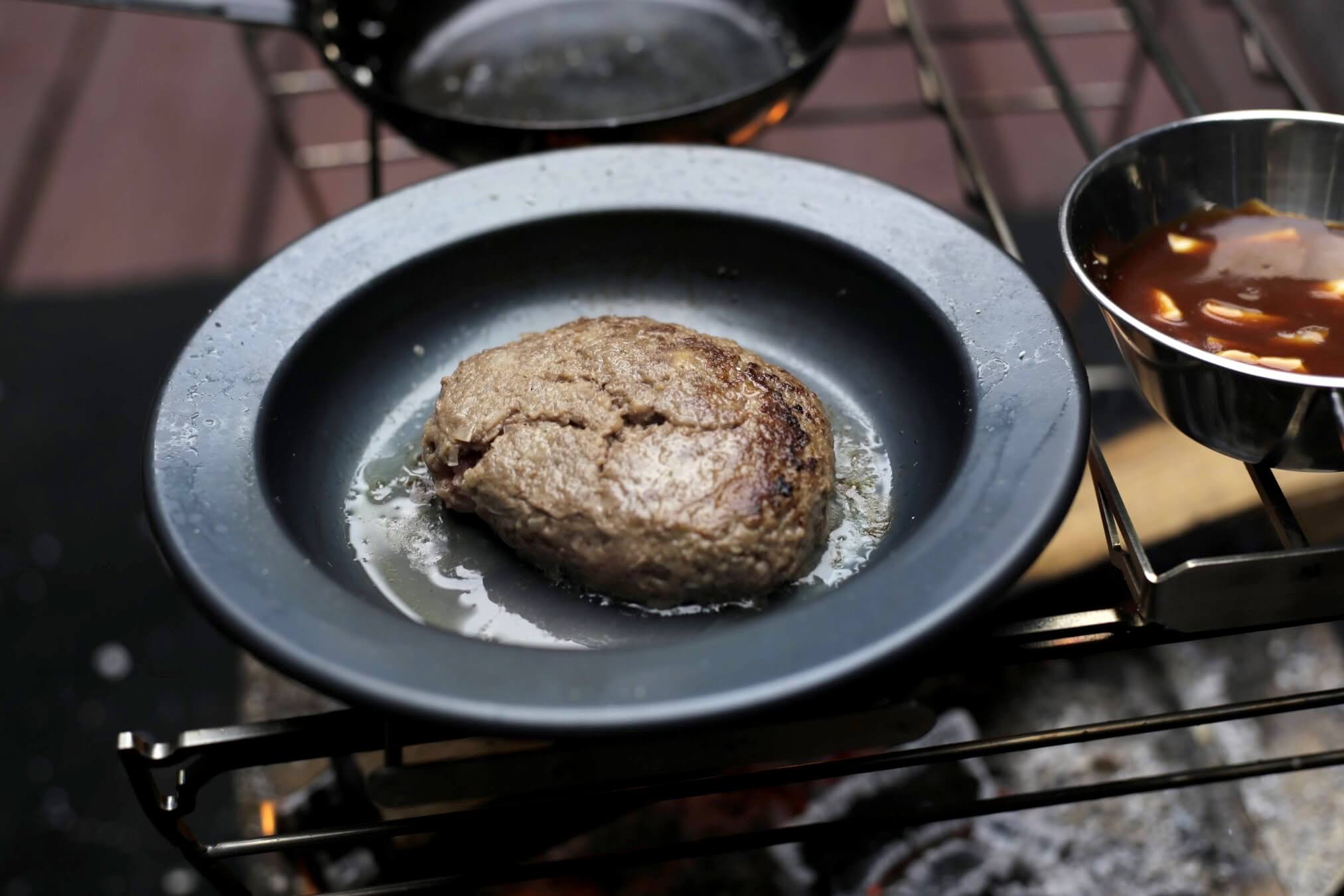 最高のハンバーグを、おしゃれな鉄フライパンで外で焼く。もう最高のシチュエーションですね。腹減ってきた。