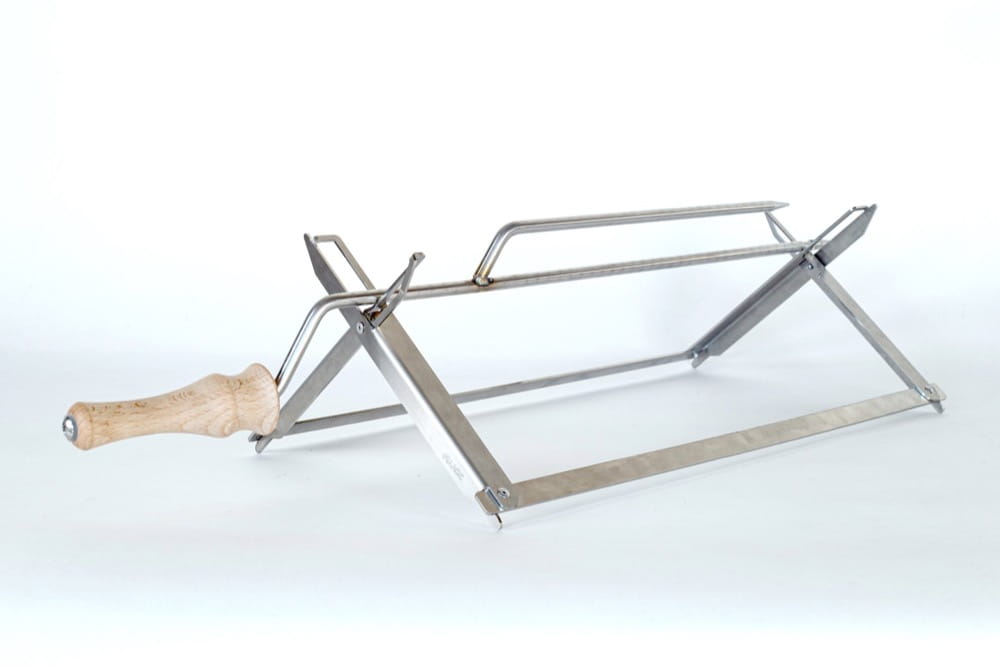 焚き火台の上にセットし、オフセット配置された木製ハンドルをくるくると回転させることで、食材の全方位から火を入れることが出来ます。