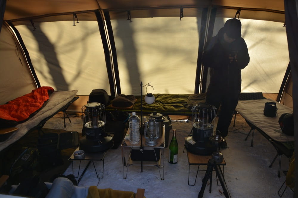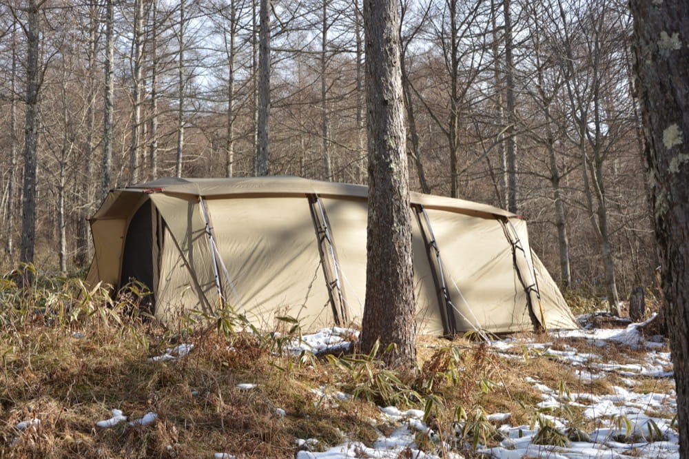 参考までに、防寒対策をご紹介。テントはOgawaアポロンを使用しました。分厚い210デニールのポリエステルなので、石油ストーブの温かさを保ってくれます。