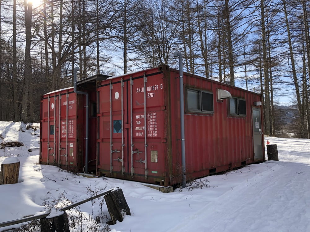 こちらのコンテナ風の建物がお手洗いです。暖房、温水便座完備でとても快適です。外は寒いですが、トイレが快適だとグッと過ごしやすくなります。