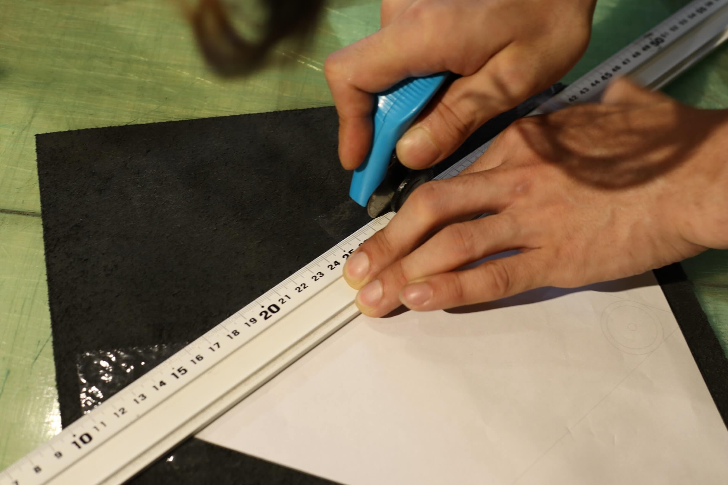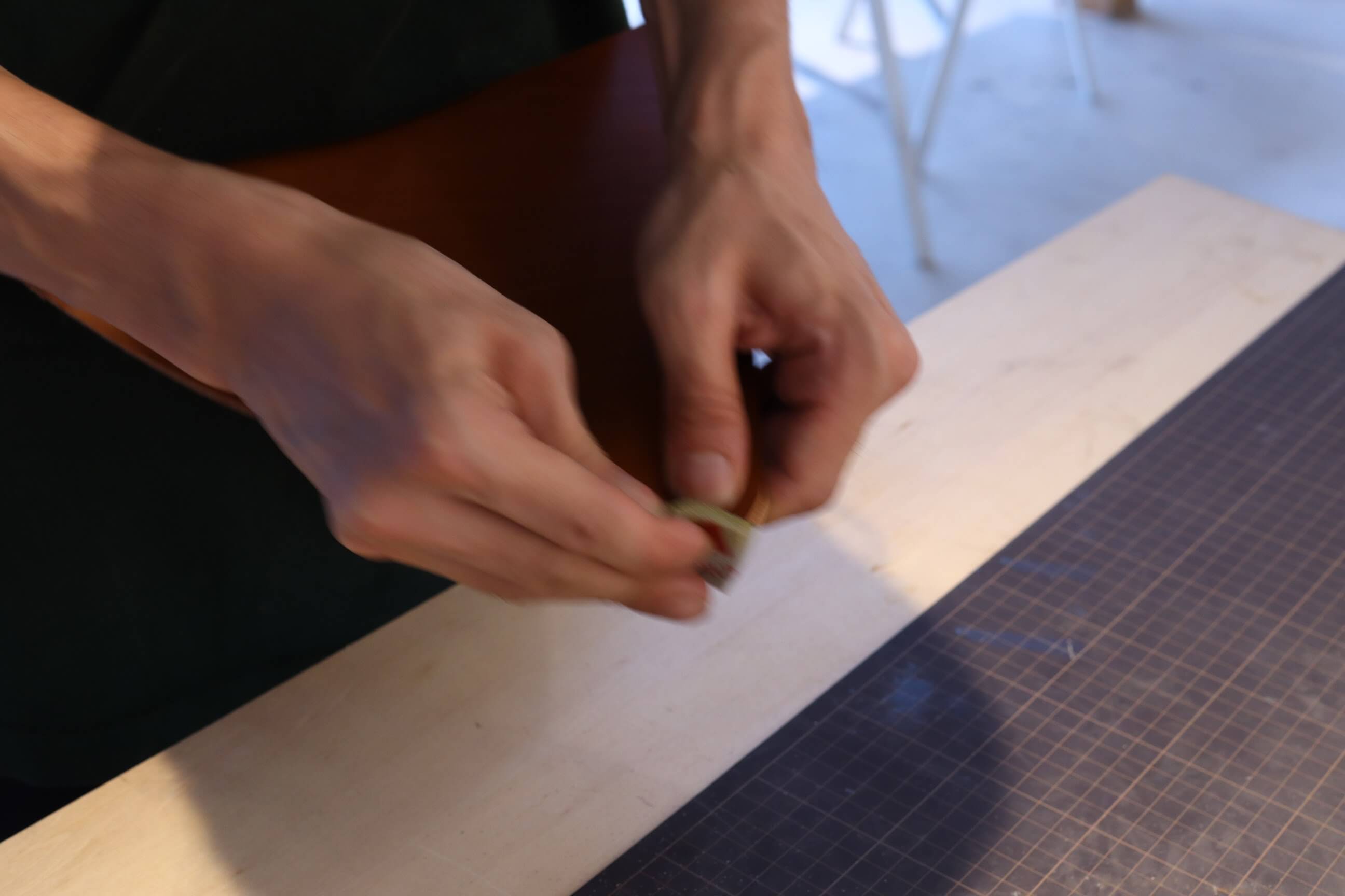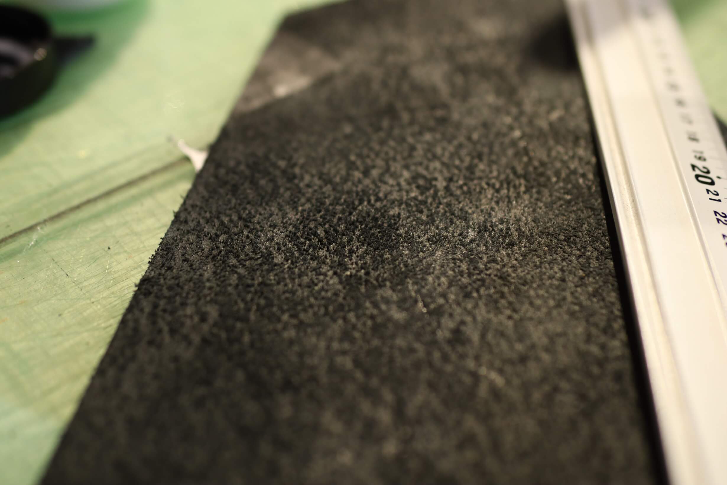 切り抜いたレザーを粗めの紙やすり(100番以下)でバリをとります。棒ヤスリでもOKですね。
