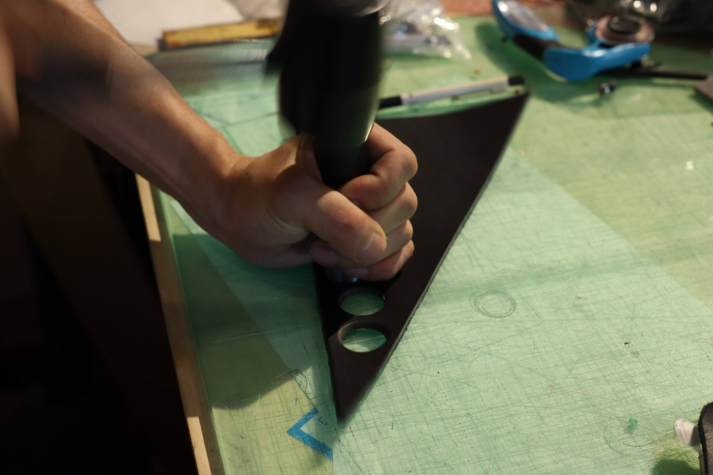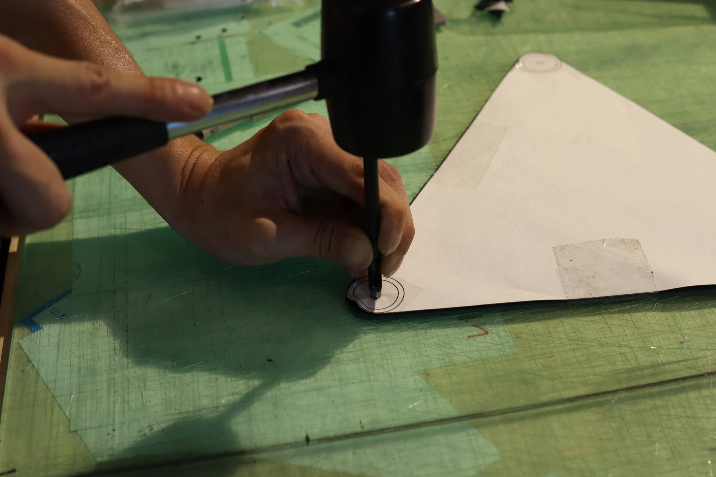 角部分に3箇所、ポンチで穴を開けます。M4のネジが通れば大きさはなんでもOK。多少皮が伸びるので少しサイズが小さくても大丈夫です。のちに脚部分とネジで接続するための穴になります。