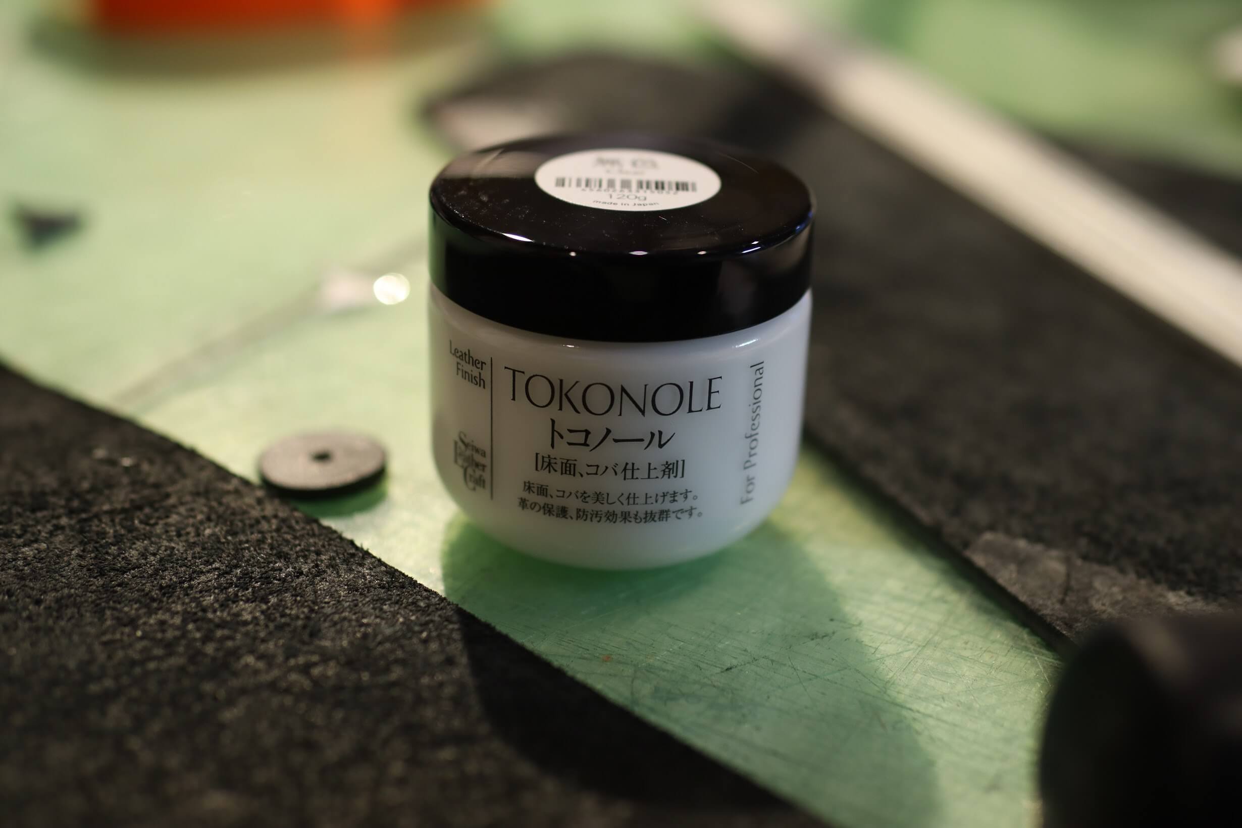 レザーにはトコノールを塗布しました。レザークラフトのフィニッシュ材ですね。切り出したレザーはエッジが落ち着かない感じになってしまうのですが、これを塗ることでヌメヌメの革質に仕上げることが出来ます。