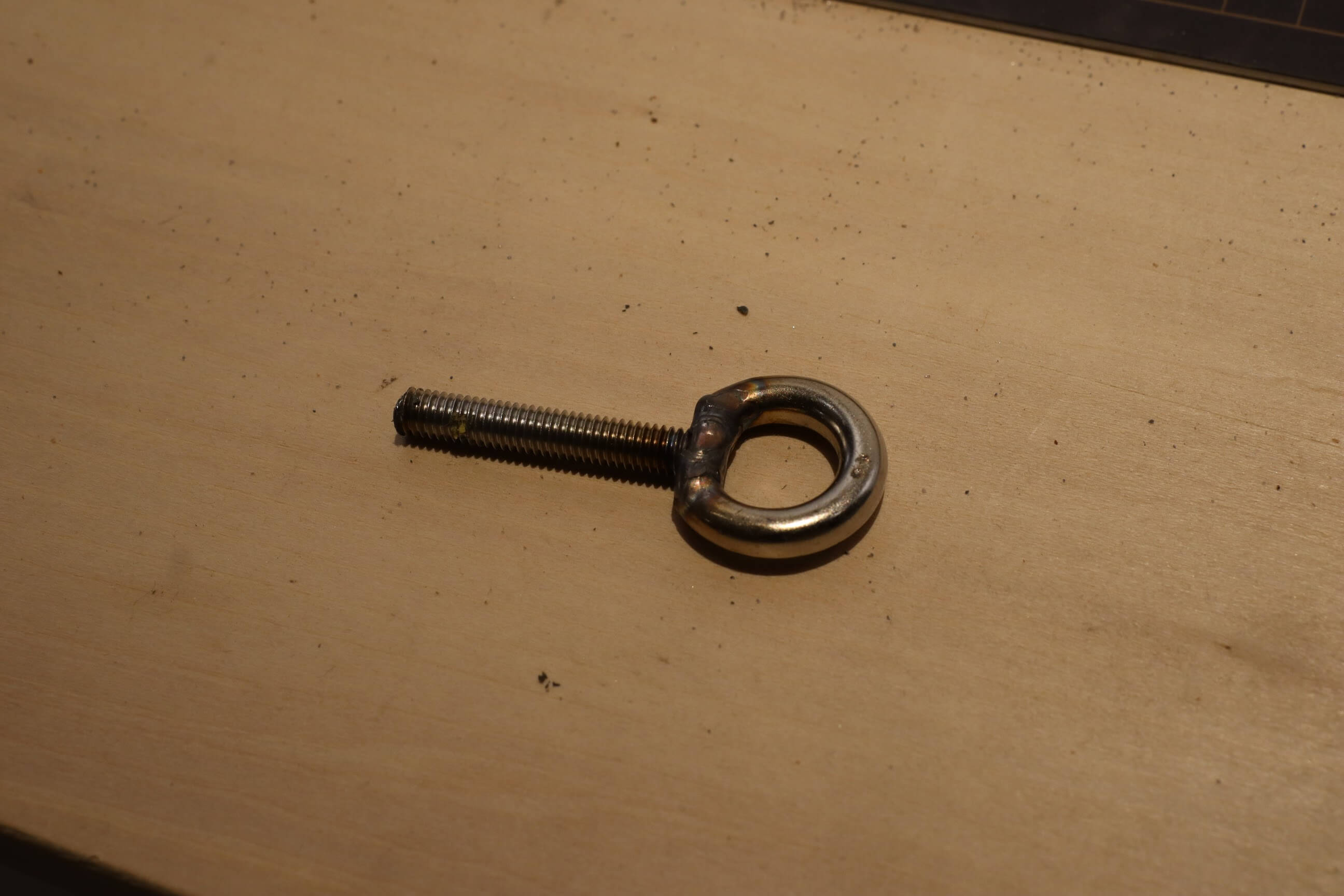アイボルトと呼ばれる特殊なネジを使用します。手元に無かったので溶接して作りましたが、普通に売っているものでOK。