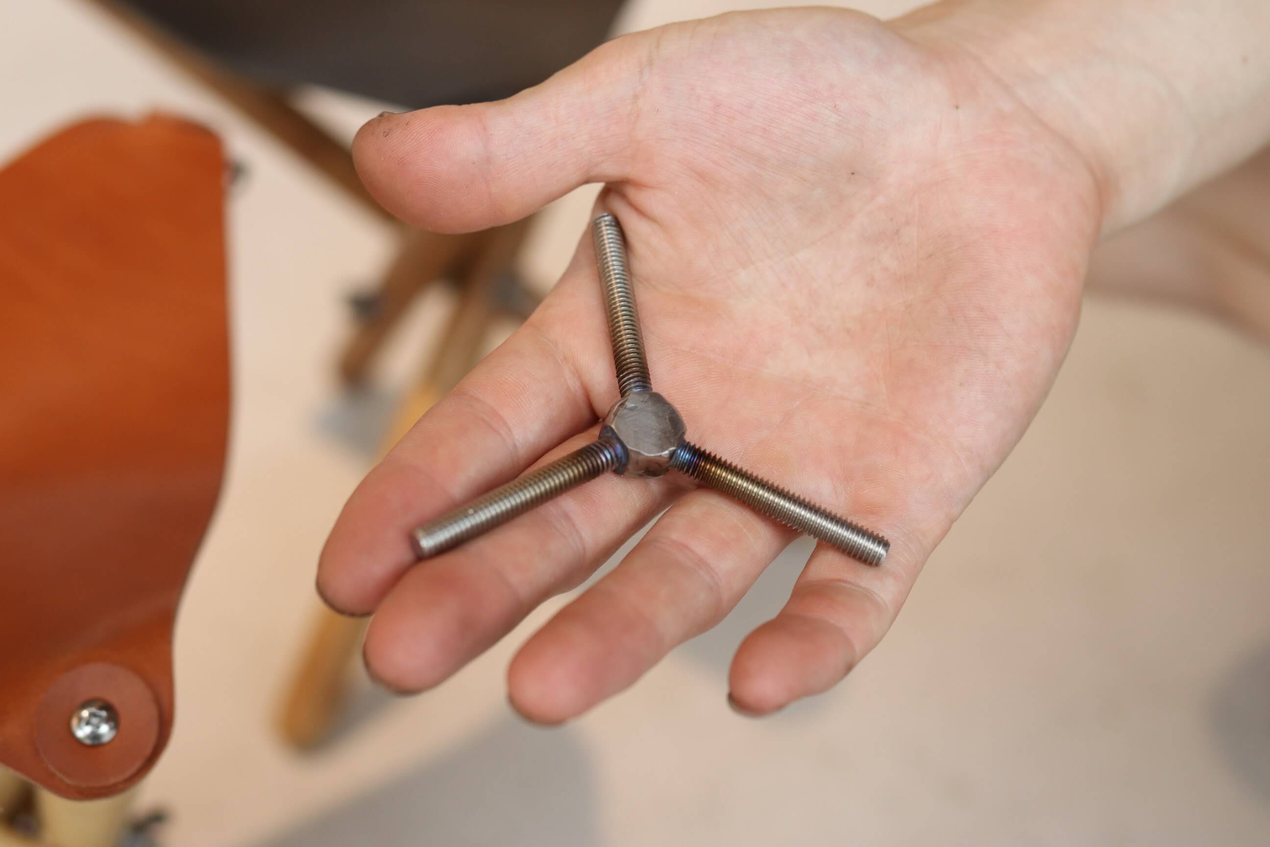 ですので、こんな感じの三俣のパーツを作って脚を固定した方が高さが揃います。しかしこれは売ってなくてM6のボルトを無理やり溶接して手作りしたパーツですのでなかなか悩ましいところです。